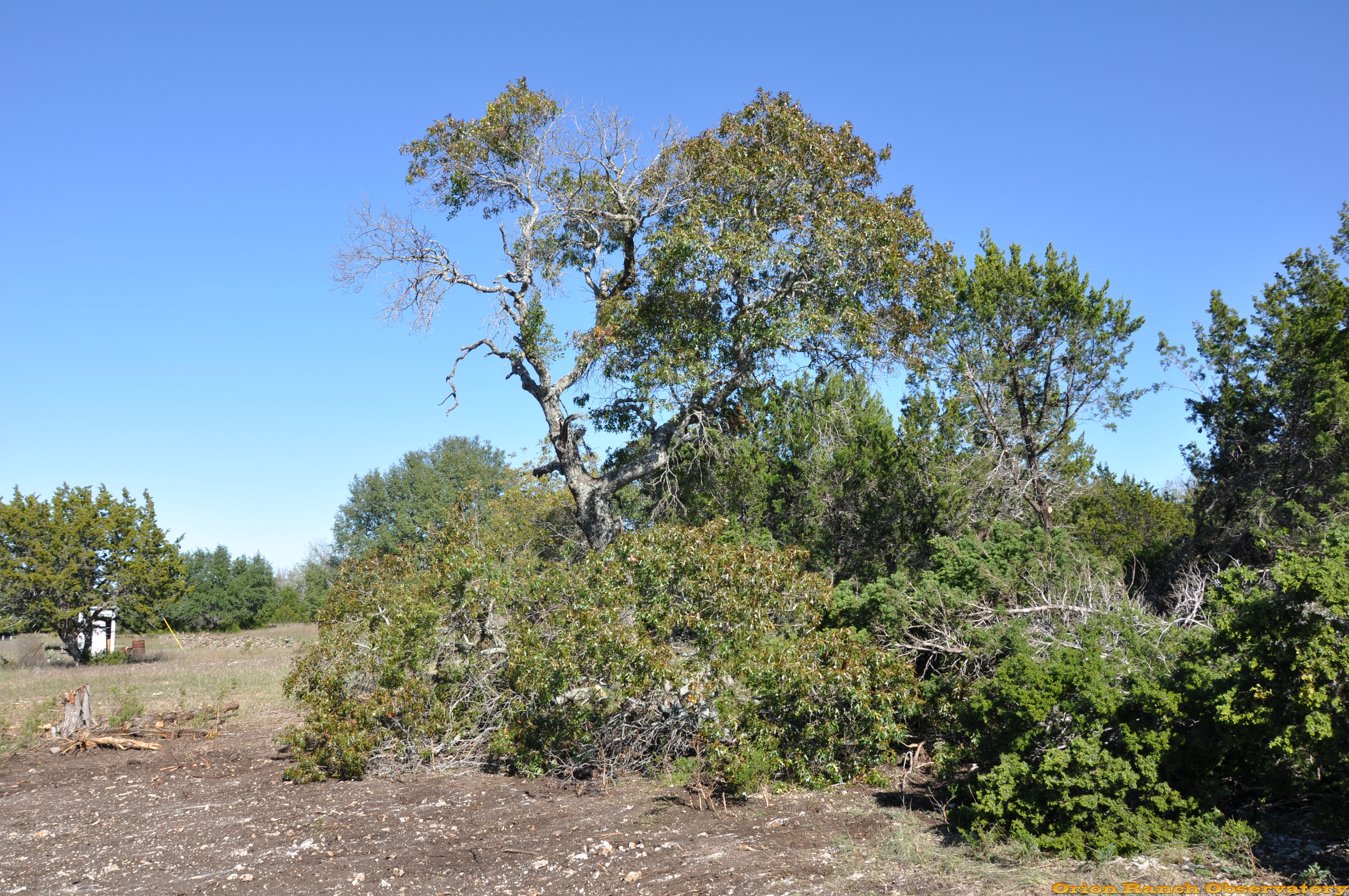 This beautiful big red oak overlooks the building site. Obviously not great for astronomy, but this location required the least amount of leveling without being too close to other trees. Nonetheless, I at least needed to trim it up. And looking north/northeast the tree doesn't look in too good of shape. October 31st, 2009.
