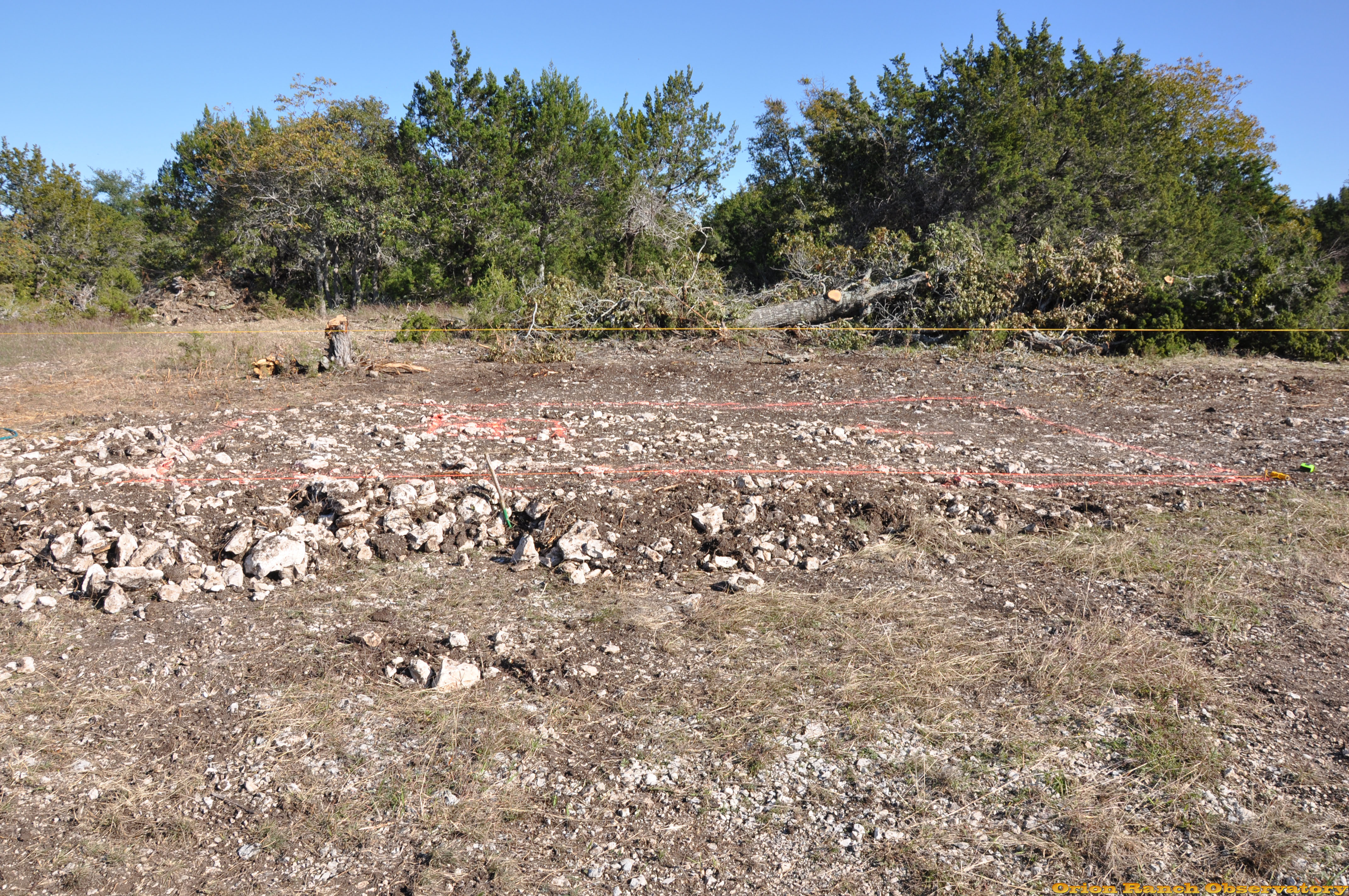 After some more work leveling the pad, it's time to lay out the slab. Here's the footprint at 14'x24' with both pier base locations marked out. November 4th, 2009.