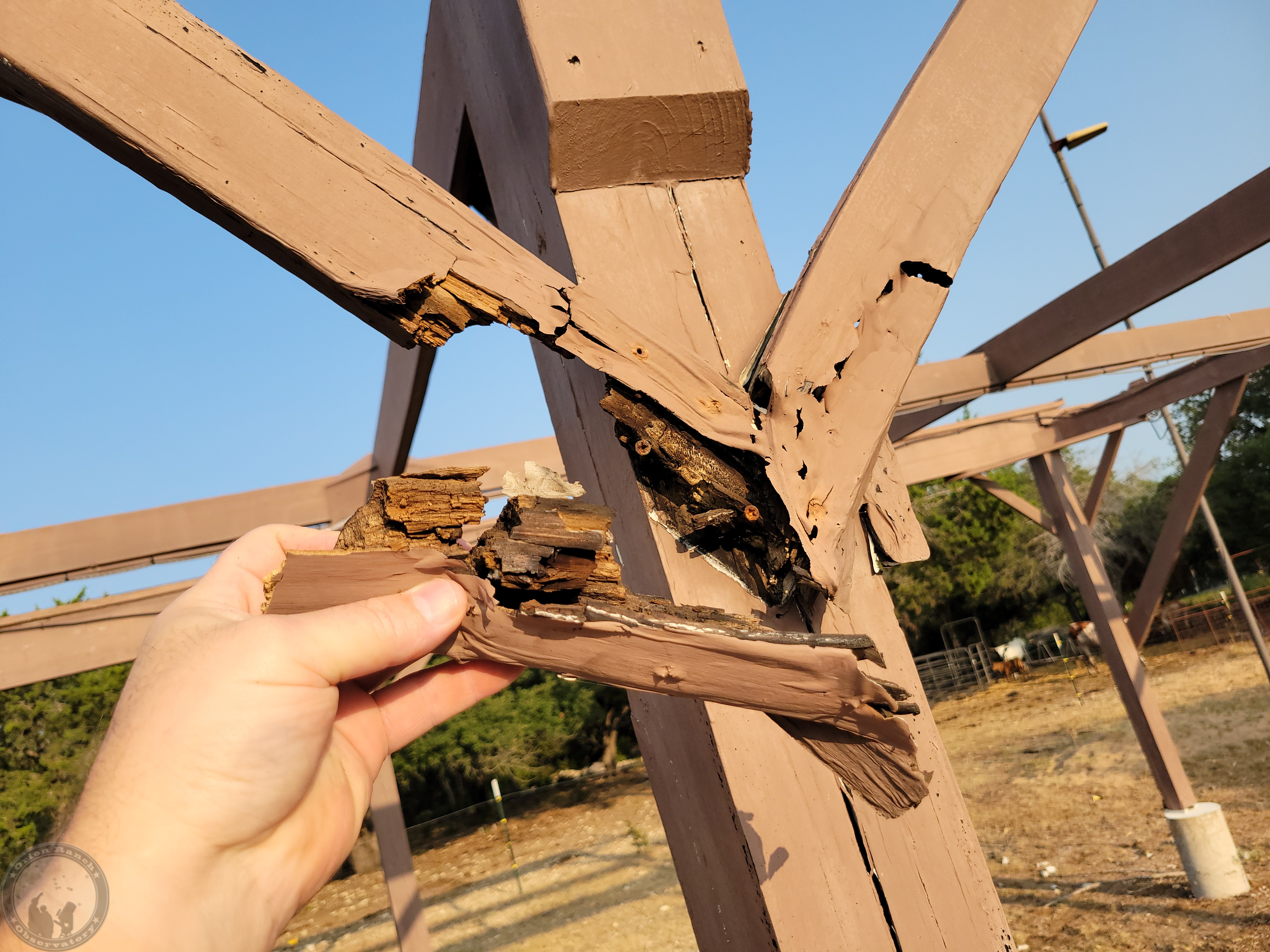 With the hot summer I discovered that the V-groove wheels of my roll-off roof were riding up on the angle iron rails that had warped somewhat in the heat. While inspecting the rail system, I discovered that the braces and a large part of the middle post had rotted away under the paint! The wood just literally crumbled away when grabbed by hand. Apparently, the water was captured in that V and was going behind the braces.