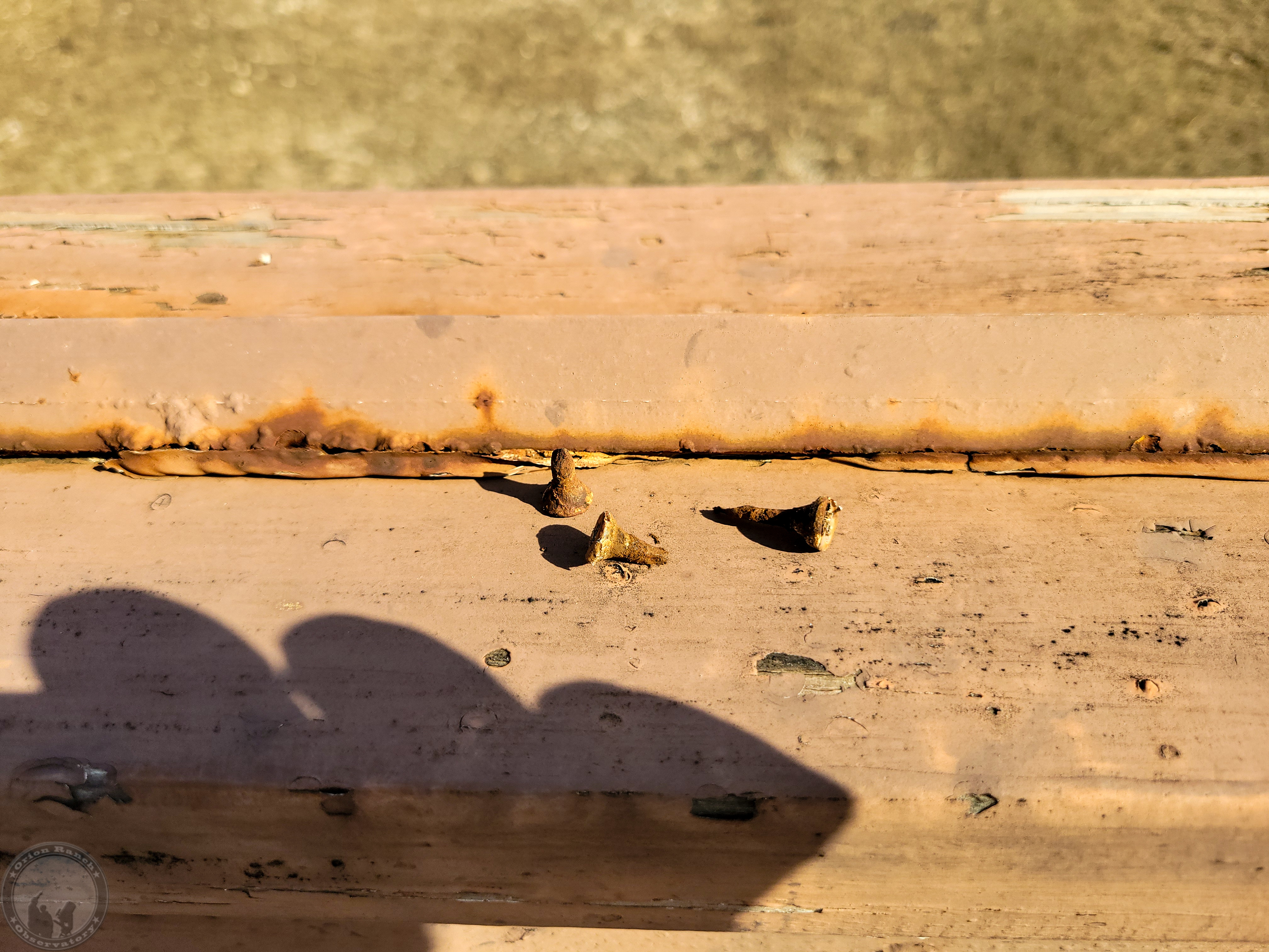 Showing what's happened to many of the screws that held the angle for the V-groove wheels down to the rail.