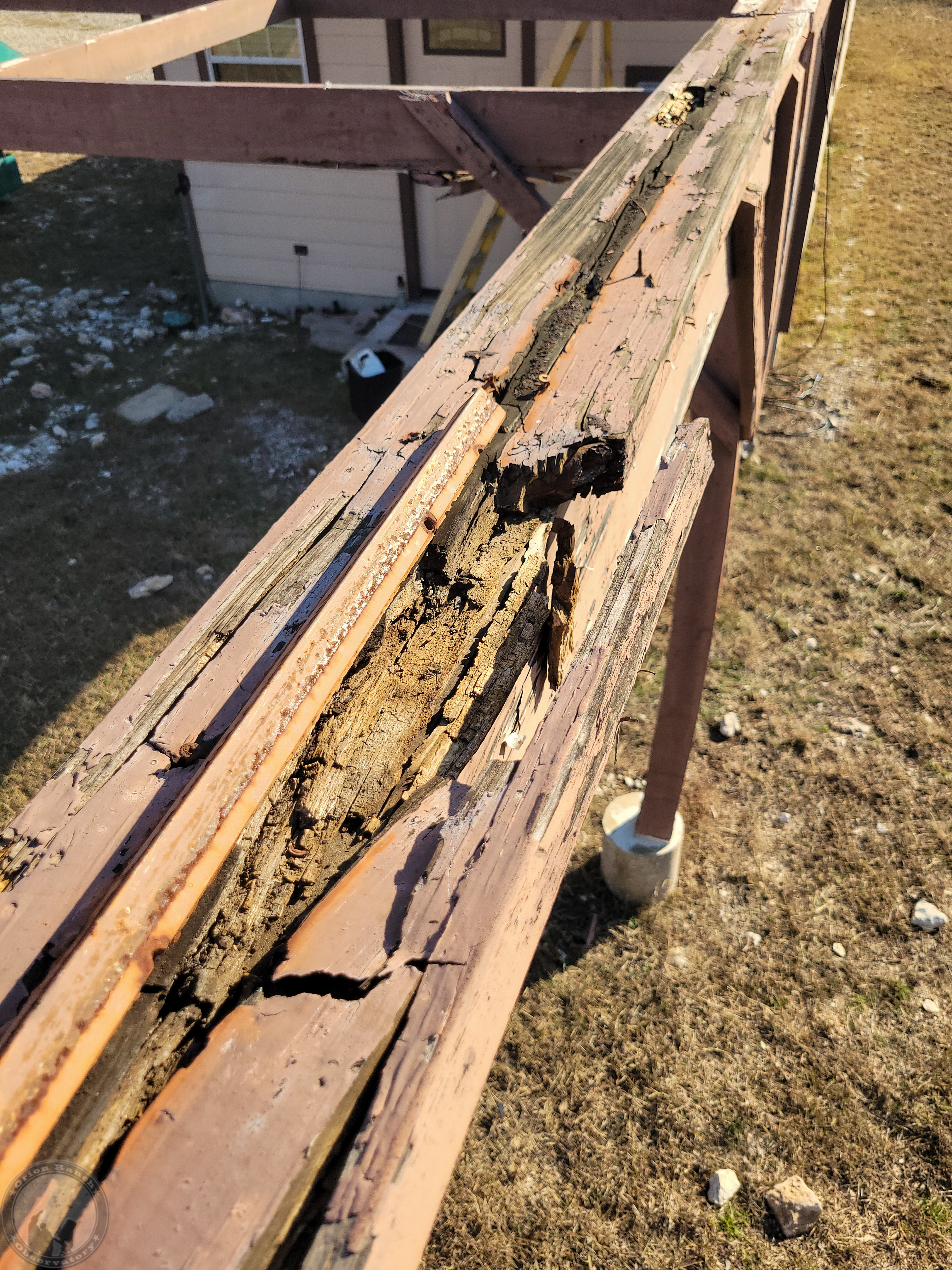 Removing all of the angle iron from the rails. Most of the rot is directly under the angle where it would hold the water. Overall, only the cap rail is damaged. The underlying beams are still in really good shape.