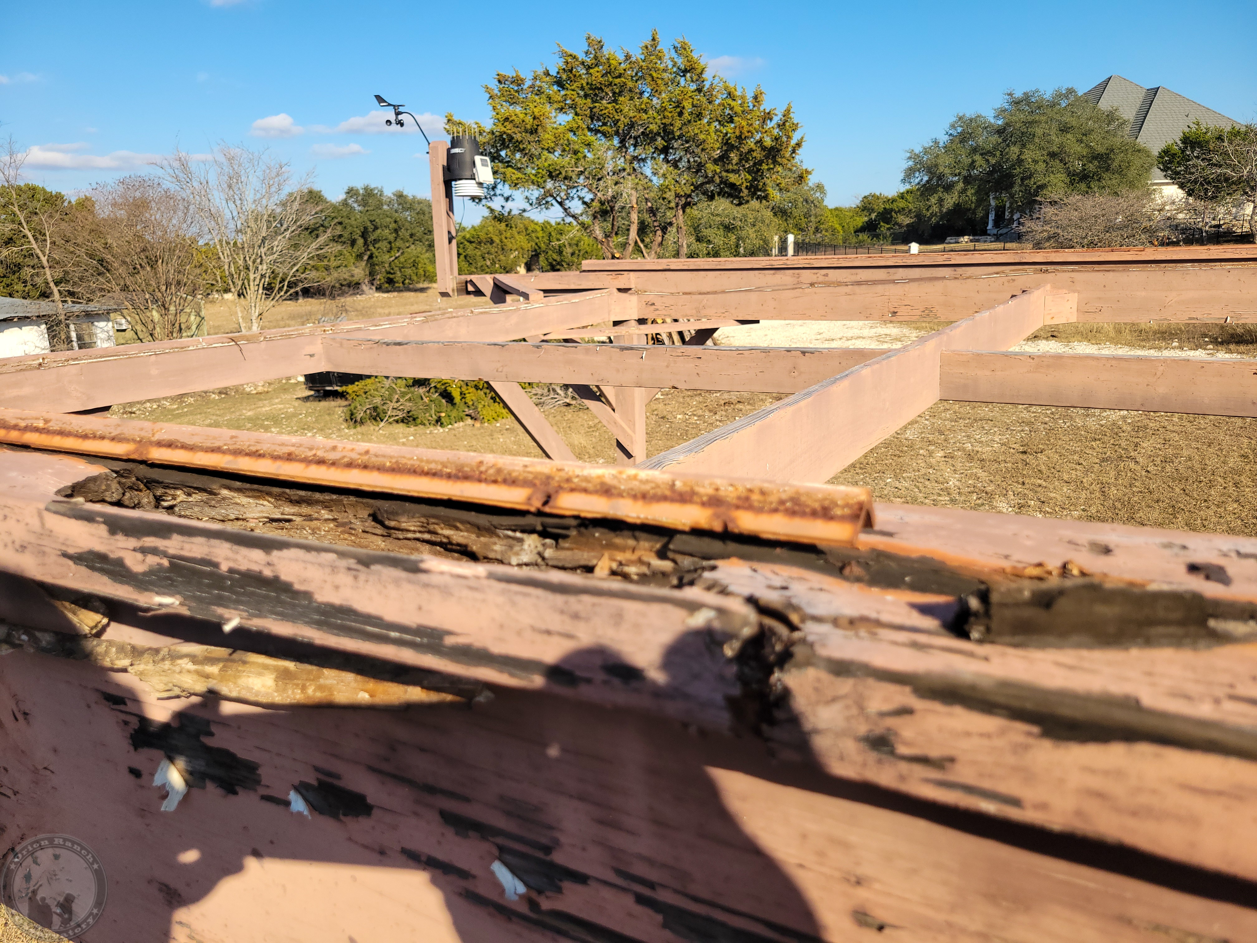 Removing all of the angle iron from the rails. Most of the rot is directly under the angle where it would hold the water. Overall, only the cap rail is damaged. The underlying beams are still in really good shape. This rot area actually looks blackened almost like it's burned on the surface. Lightning?