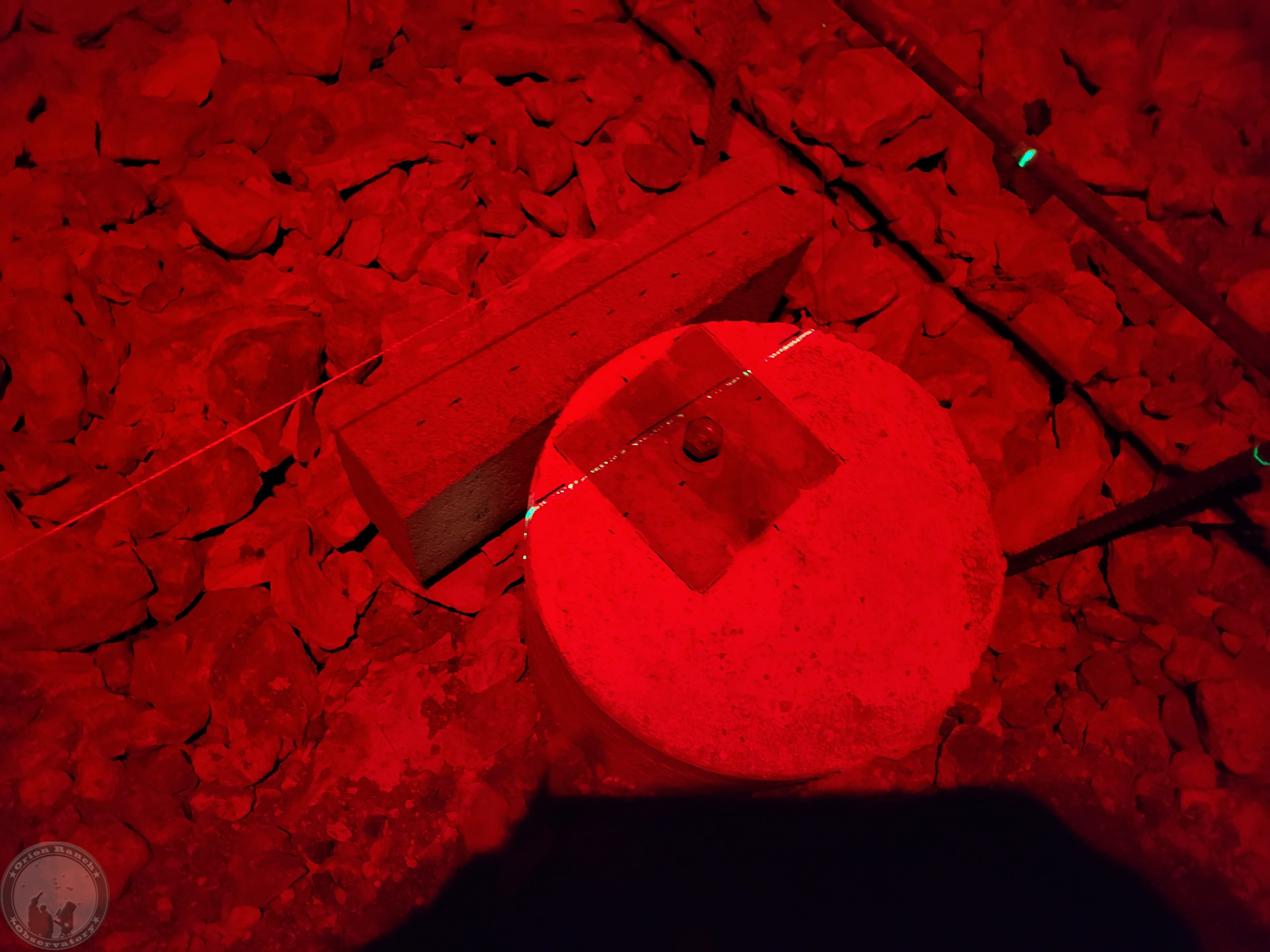 Aligning the self leveling laser on the marks from yesterday, and they hit the V-groove angle iron rail pretty well, but if you look closely, there's a bit of front-to-back variation on where it's hitting.