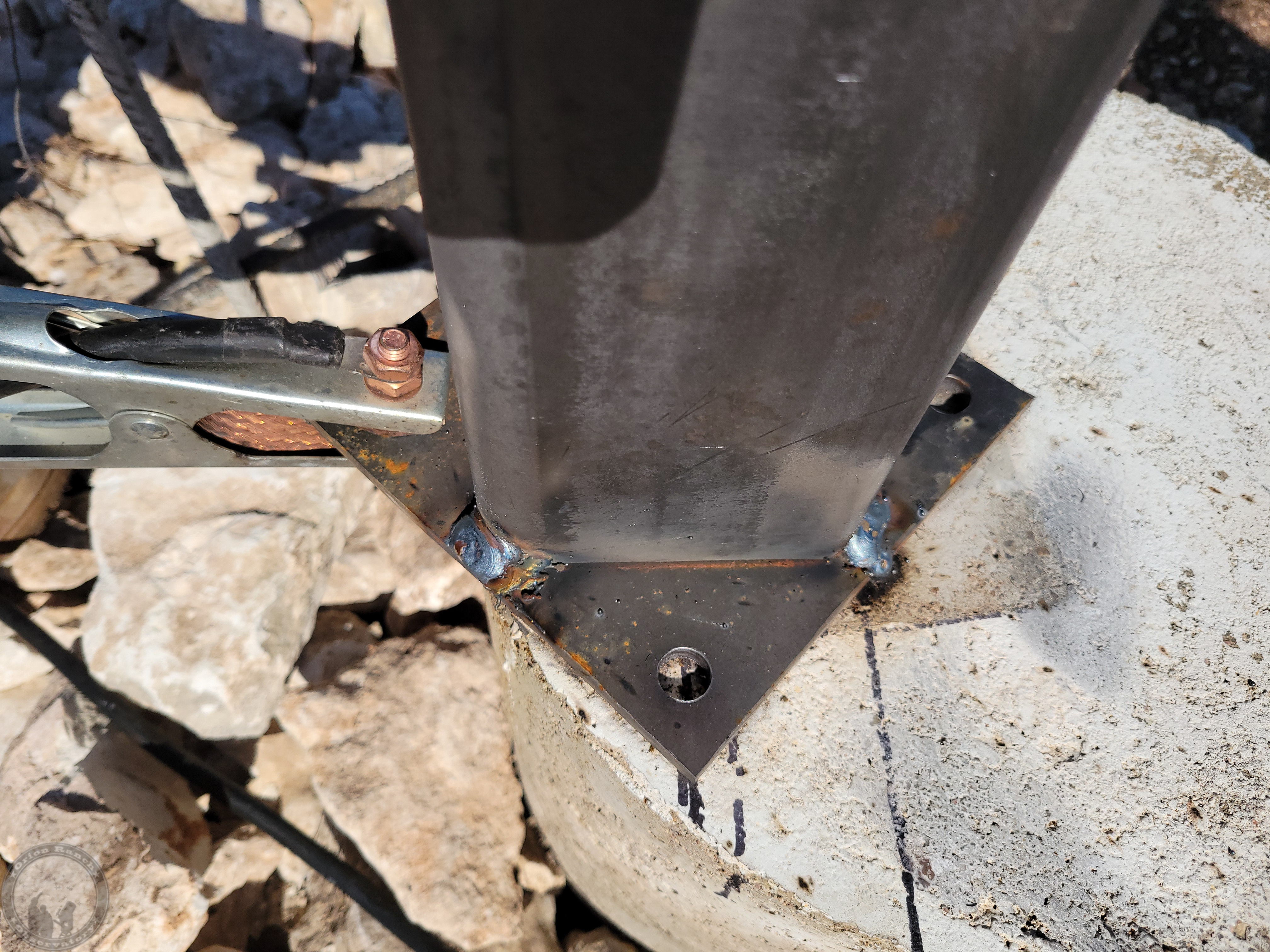 Tacking the four corners of the first post, starting with the tallest corner and then wedging each side up to get the post vertical/level.