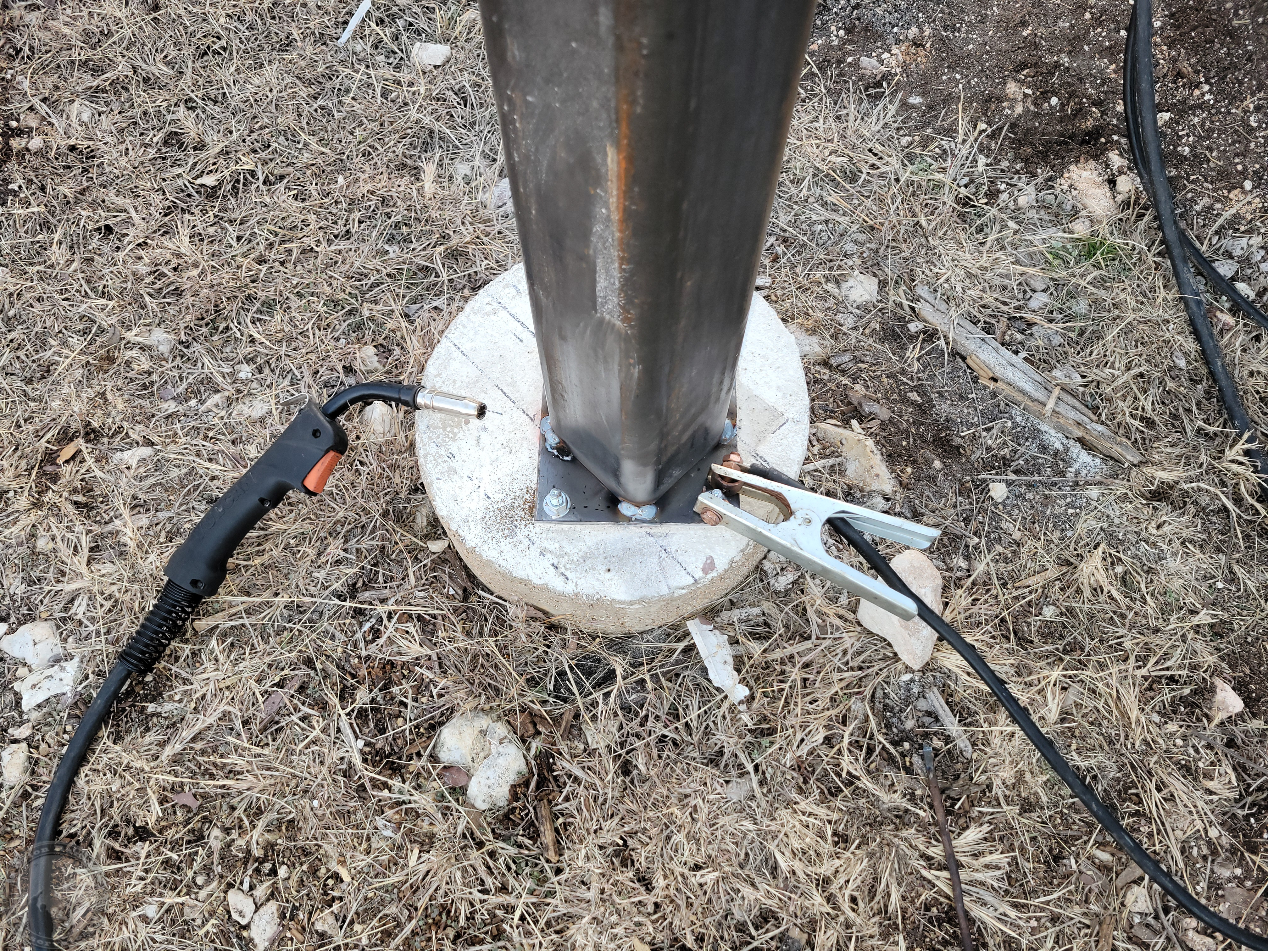 Tacking the corners of the last post after lining everything up. These are quite solid with just these welds. I'll finish the full welds after I get the tops capped (i.e. after the rails are in place). For one thing, I don't want to risk rain water pooling in the bottom of the post, although it should still drain out through the center hole.