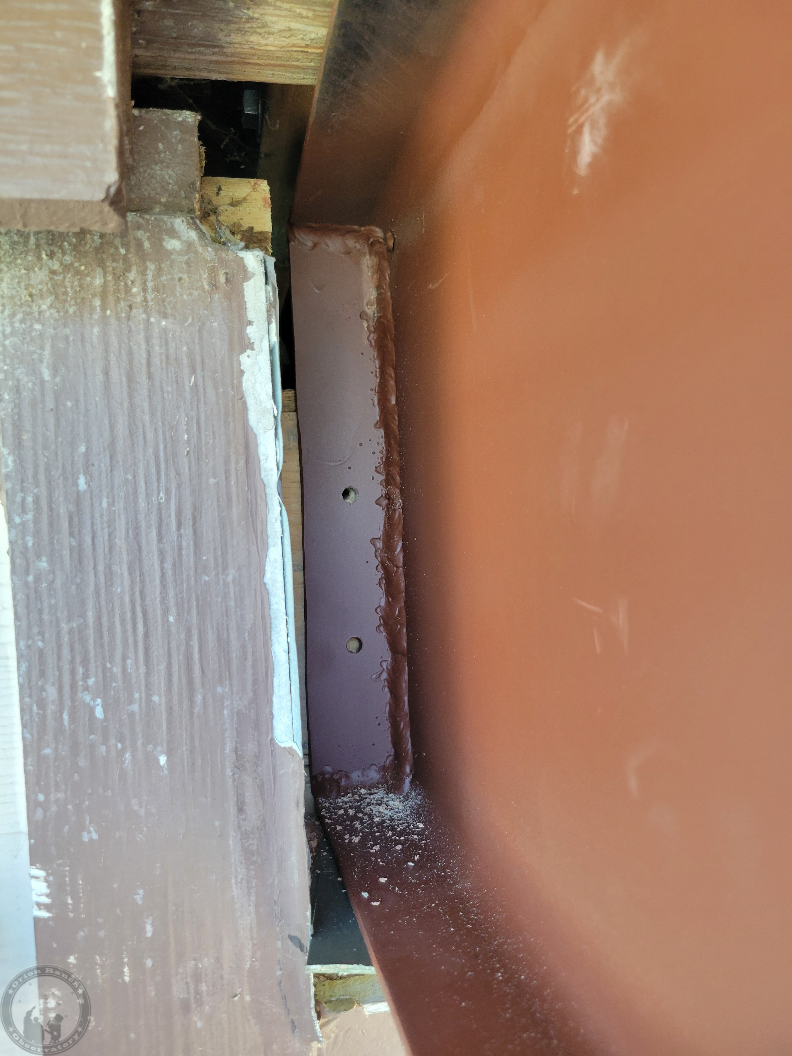 Drilling a pilot hole for the first bolt at the top of the hole in the steel to make sure the lag bolt pulls it up as well as in to tighten everything.