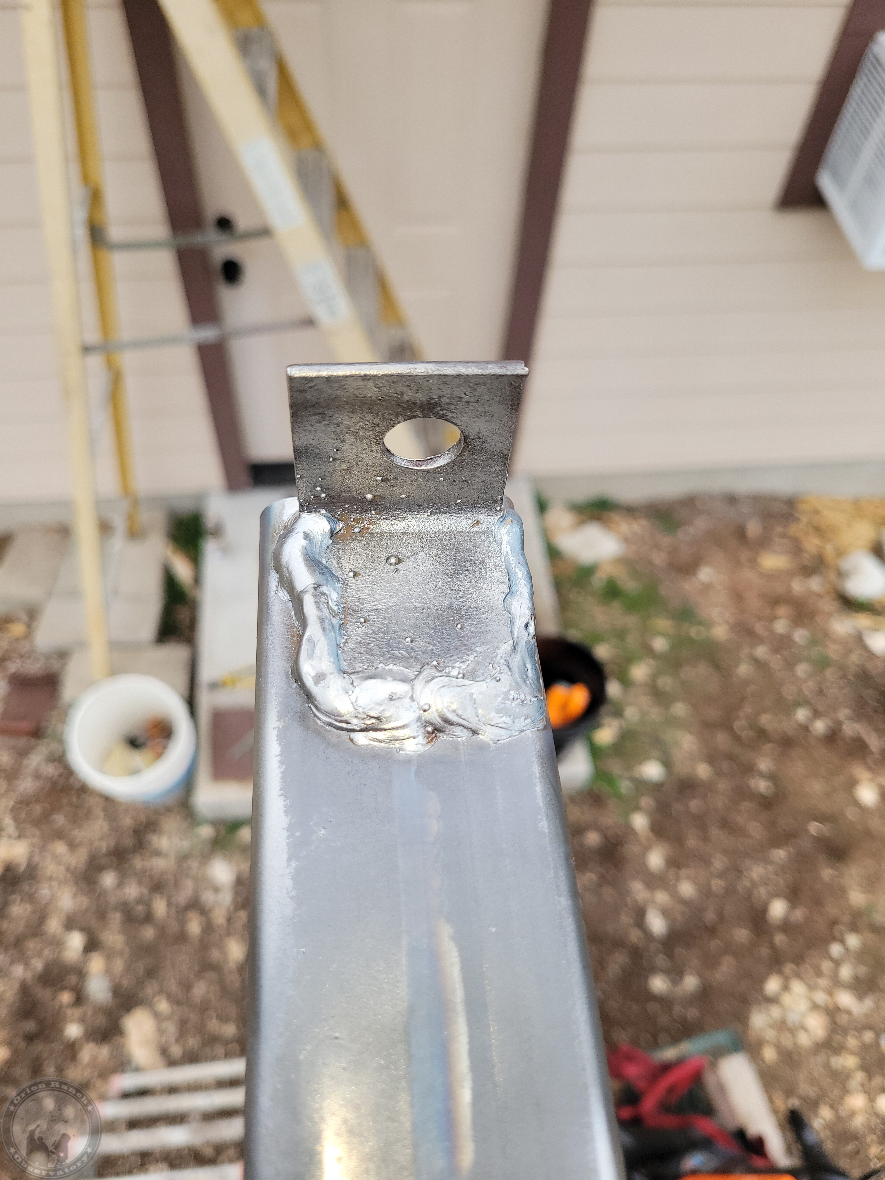 Adding a small scrap of angle iron to allow lag-bolting the beam to the face of the warm room ceiling joists.
