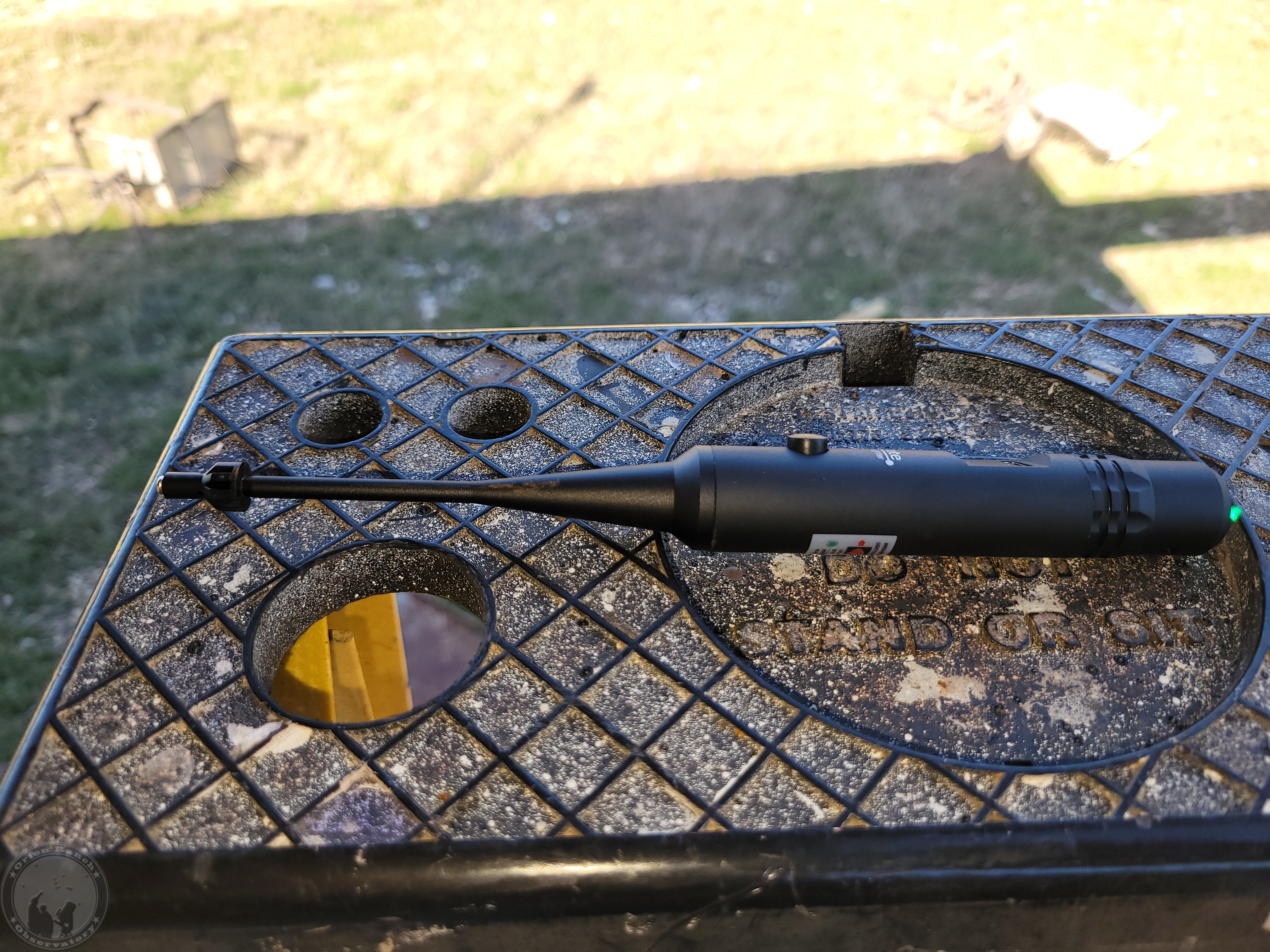 I tried multiple attempts to align a laser along the side of the rail inside the observatory and shoot it out past the roof, but none of my lasers were designed to sit right and placement was way too finicky. So instead, I went back to trying to boresight off of the angle iron rails using a boresight laser. That was finicky too, since any bit of rust in the tube would be enough to set it off, but this laser let me make three-point contact in the front and two points in the back to get it to settle straight. The west rail still had a problem because the angle was up off of the metal, so I rolled the roof off a foot and a half to push it down. Then the spot ended up right on center, but you can see the black dot near my sleeve cuff where it was pointing originally. I'm pretty happy with this alignment sitting right in the middle of the rail!