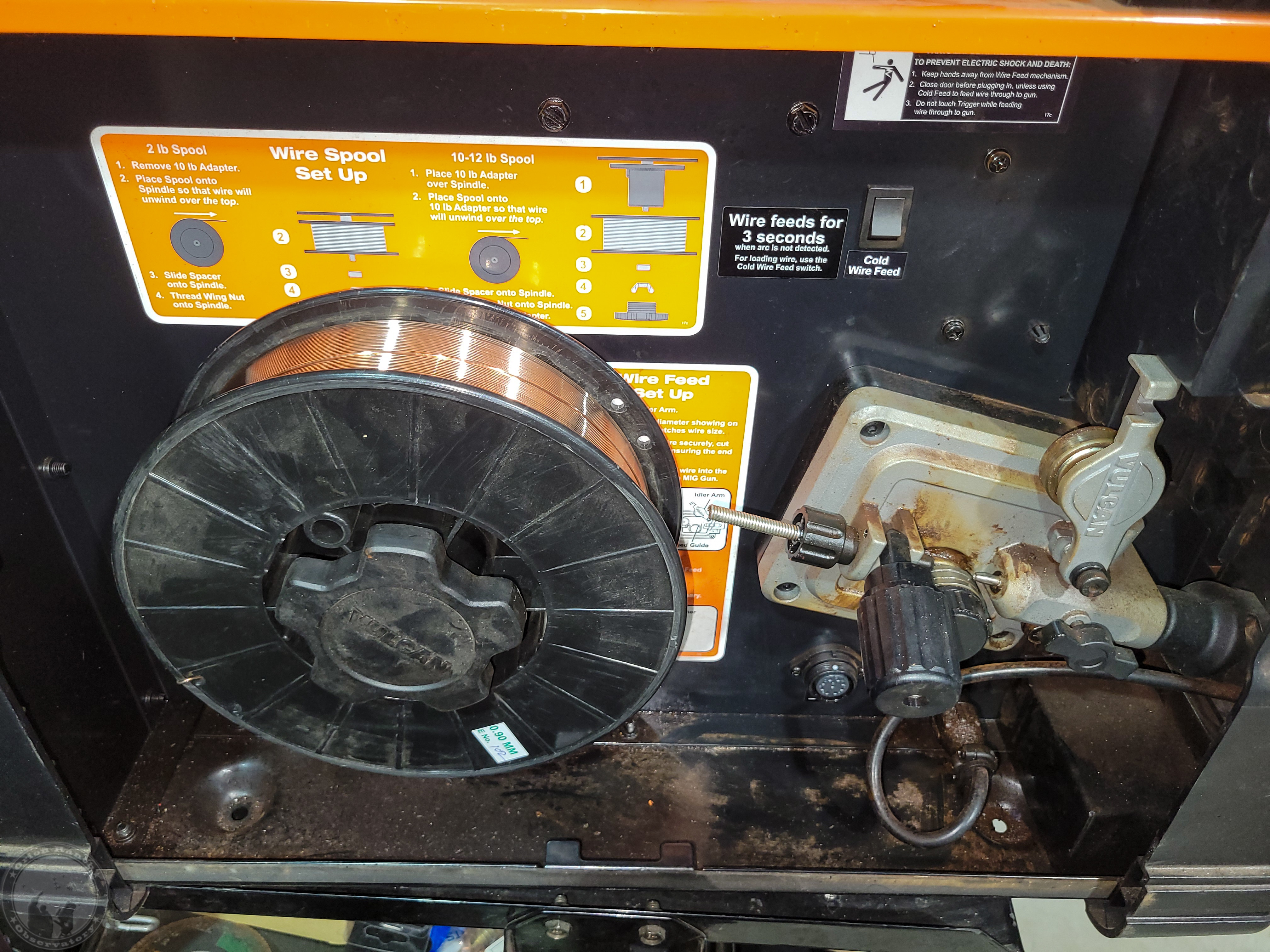 Installing the new roll of wire and routing it through the cable to the torch.