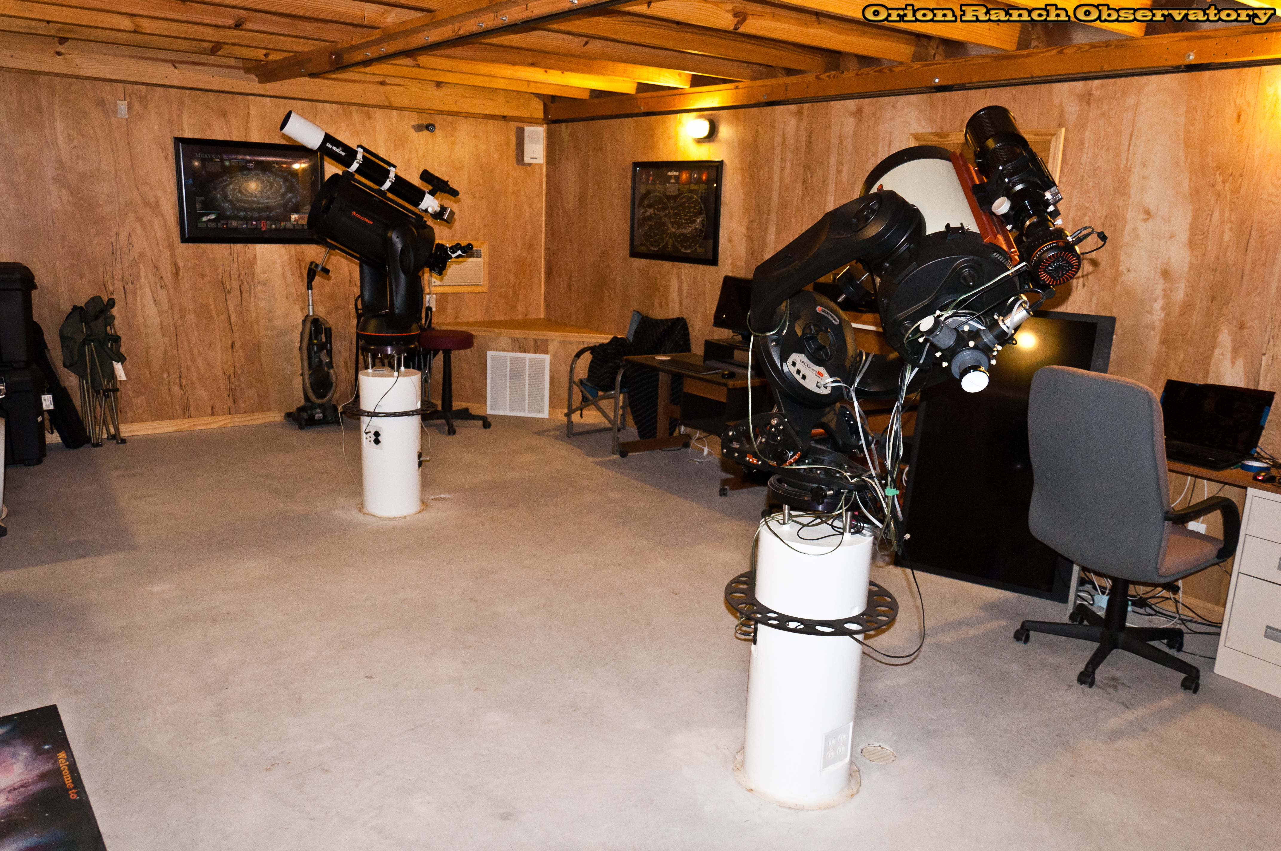 Various views around the observatory showing the 11" Edge HD with the AT80LE piggy-backed for imaging. The Sky Watcher ED-100 is piggybacked on the 11" NexStar GPS we use for visual observing with the Williams Optics binoviewer.