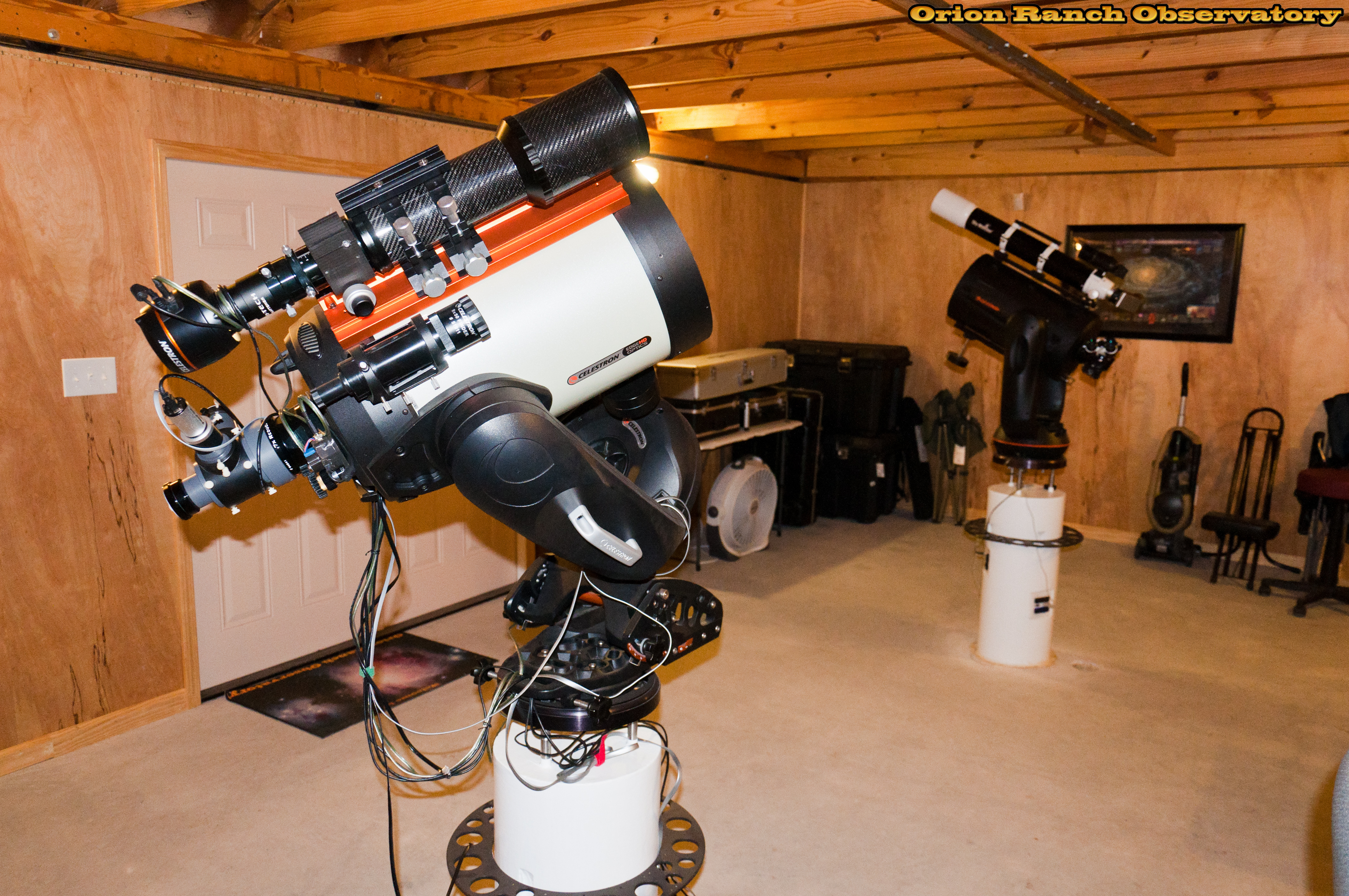 Various views around the observatory showing the 11" Edge HD with the AT80LE piggy-backed for imaging. The Sky Watcher ED-100 is piggybacked on the 11" NexStar GPS we use for visual observing with the Williams Optics binoviewer.