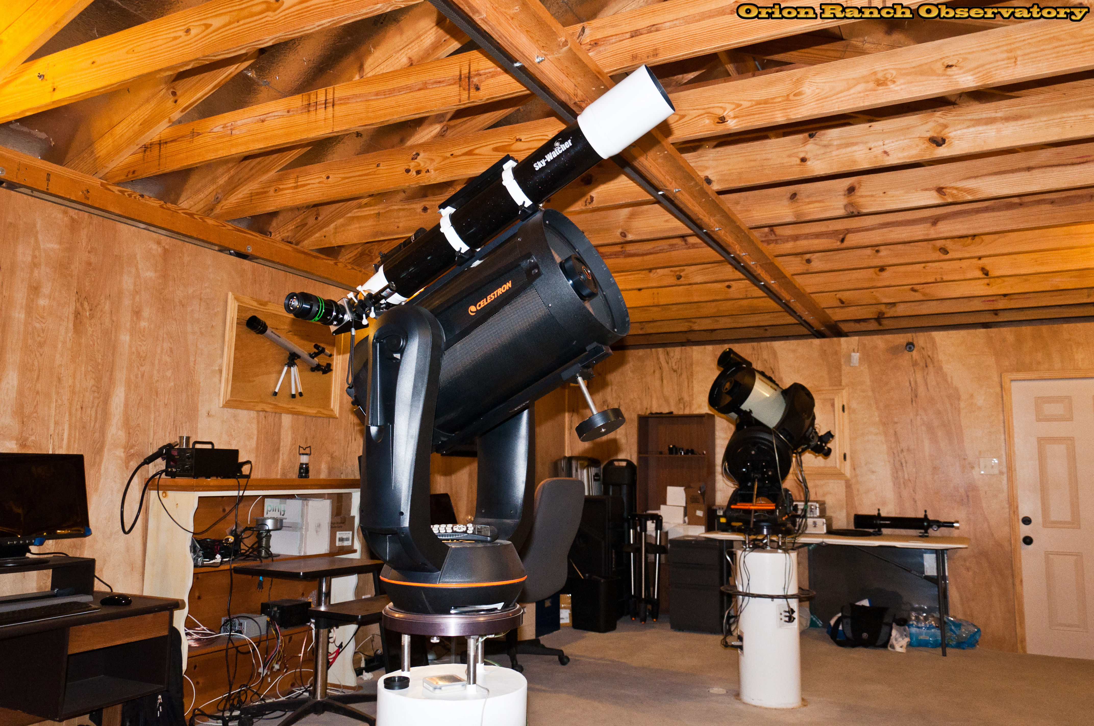 Various views around the observatory showing the 11" Edge HD with the AT80LE piggy-backed for imaging. The Sky Watcher ED-100 is piggybacked on the 11" NexStar GPS we use for visual observing with the Williams Optics binoviewer.
