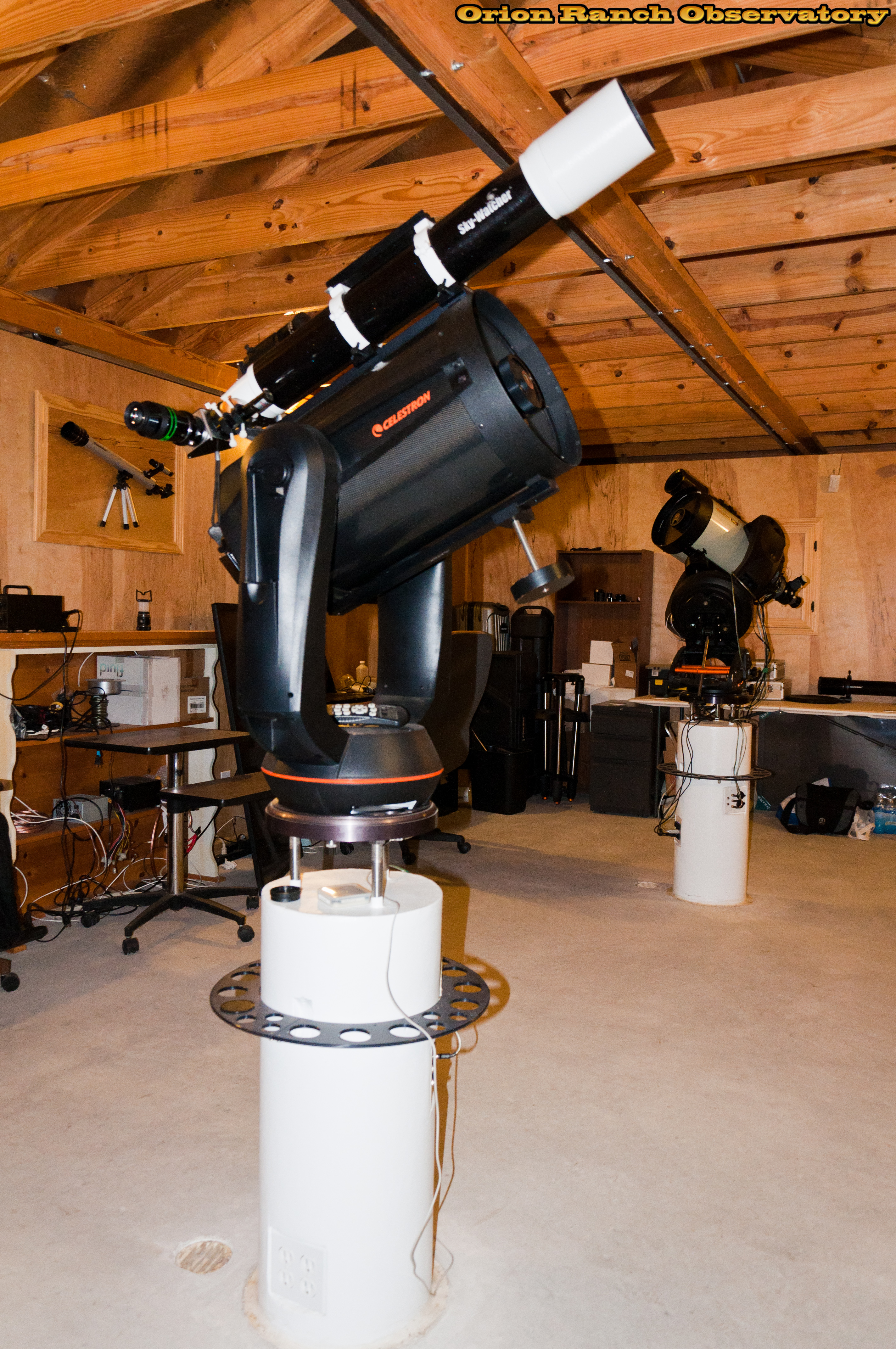 Various views around the observatory showing the 11" Edge HD with the AT80LE piggy-backed for imaging. The Sky Watcher ED-100 is piggybacked on the 11" NexStar GPS we use for visual observing with the Williams Optics binoviewer.