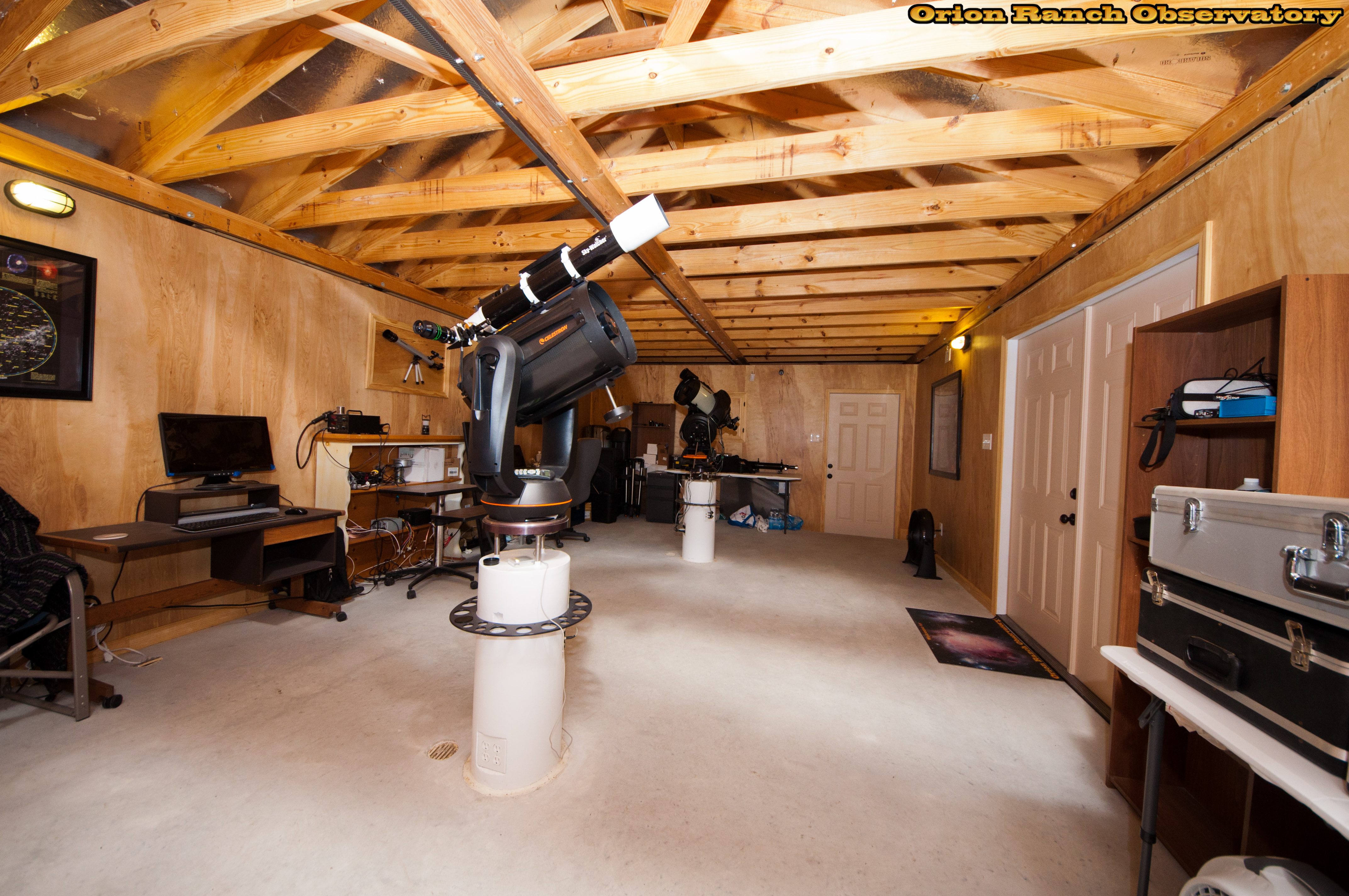 Various views around the observatory showing the 11" Edge HD with the AT80LE piggy-backed for imaging. The Sky Watcher ED-100 is piggybacked on the 11" NexStar GPS we use for visual observing with the Williams Optics binoviewer.