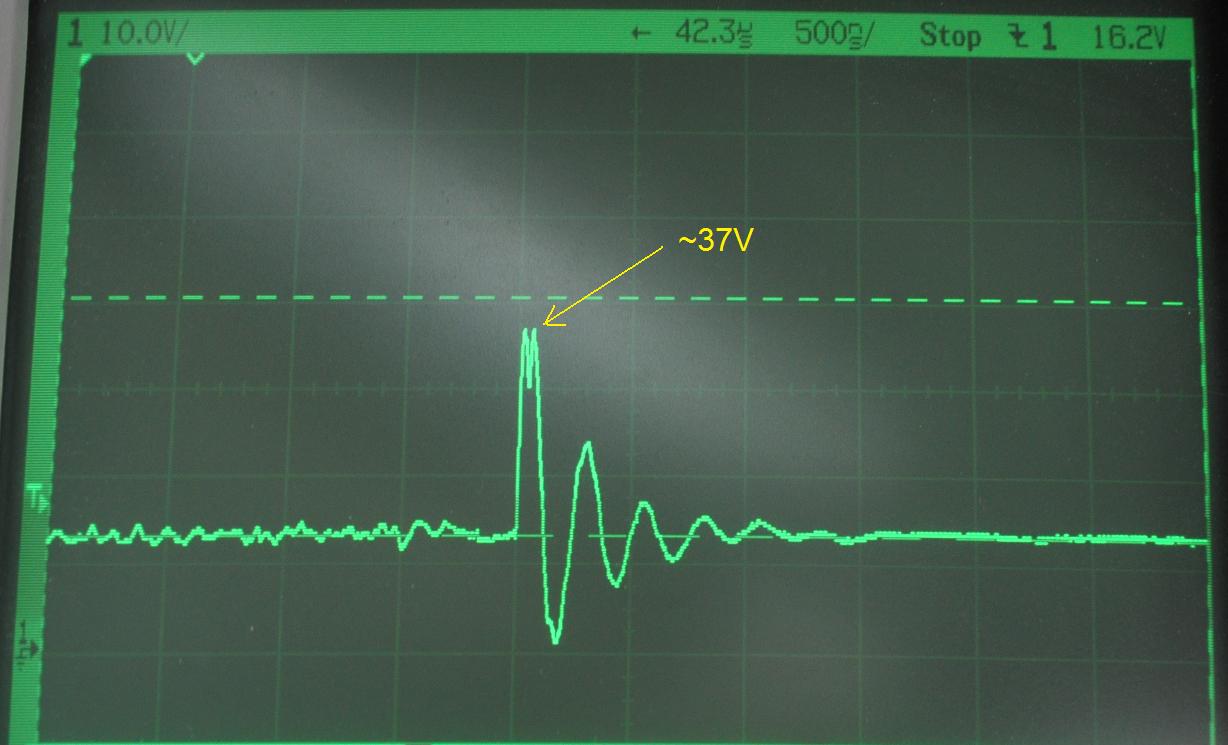 Here's a zoomed in view of that biggest pulse. Note that if it wasn't for a second harmonic riding on top of the first oscillation, this would have easily exceeded the 40V or more pulse that one can expect to see when switching off a high current load.