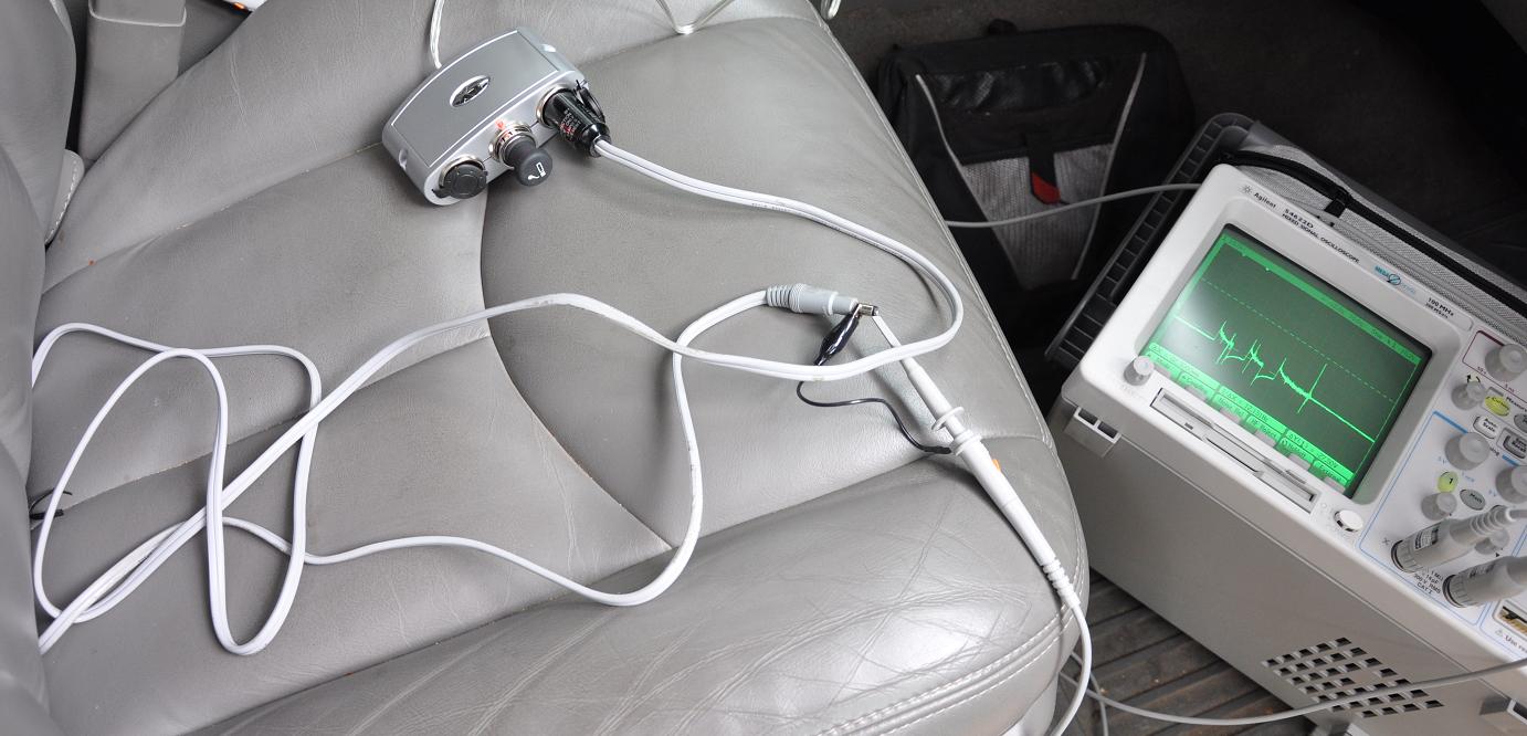 Here's the test setup. A three-way cigarette lighter splitter is plugged into the truck accessory port with the engine off (12V battery power only). The oscilloscope is connected to the power cable that would normally run my Meade mount. The cigarette lighter is used to simulate the load of a dew heater, and the oscilloscope is configured to trigger on any voltage rising above about 16 volts.