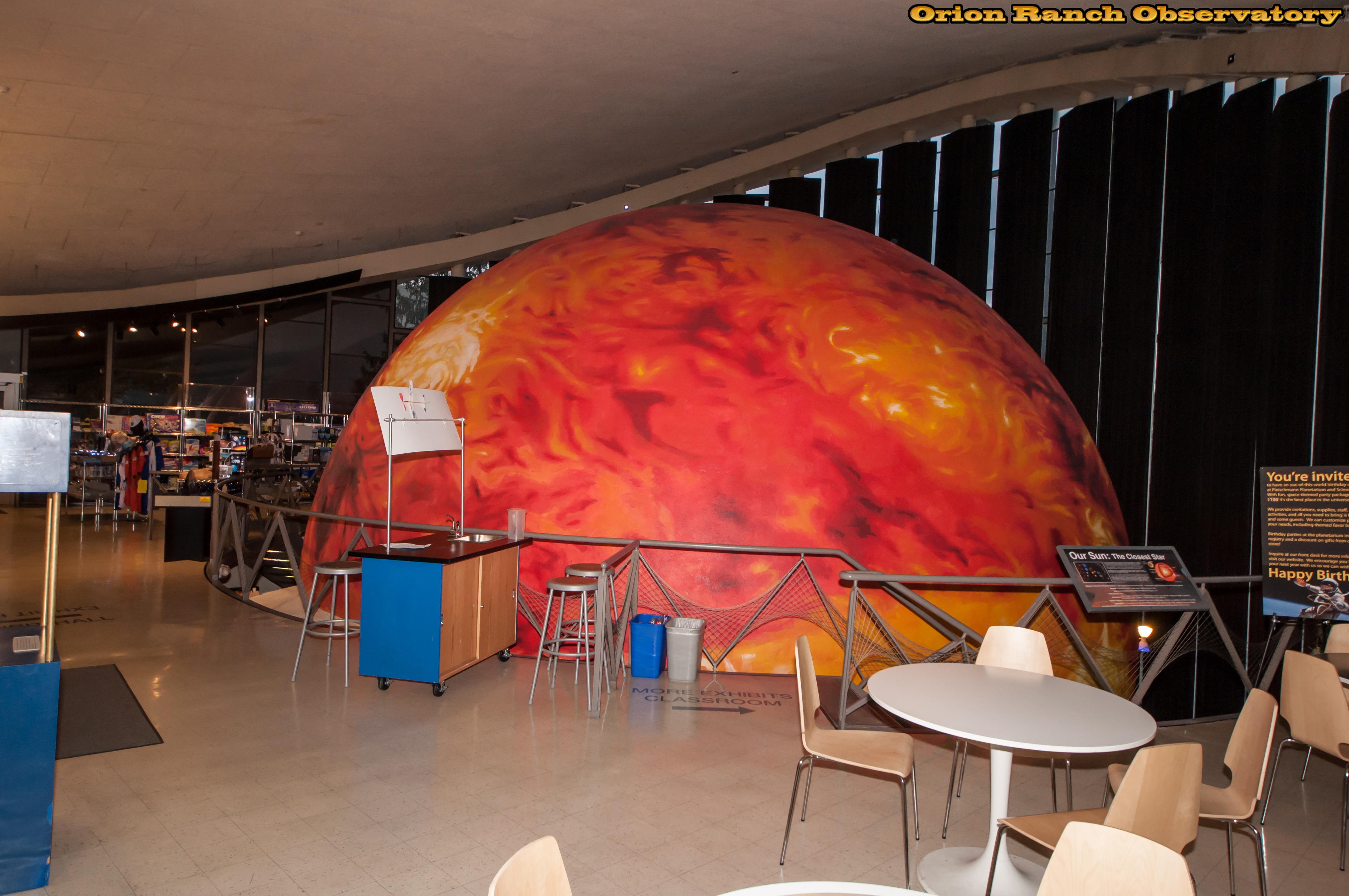 Open area on the second floor showing the planetarium dome, whcih is painted to represent the sun. Note the planet decals on several of the tables.