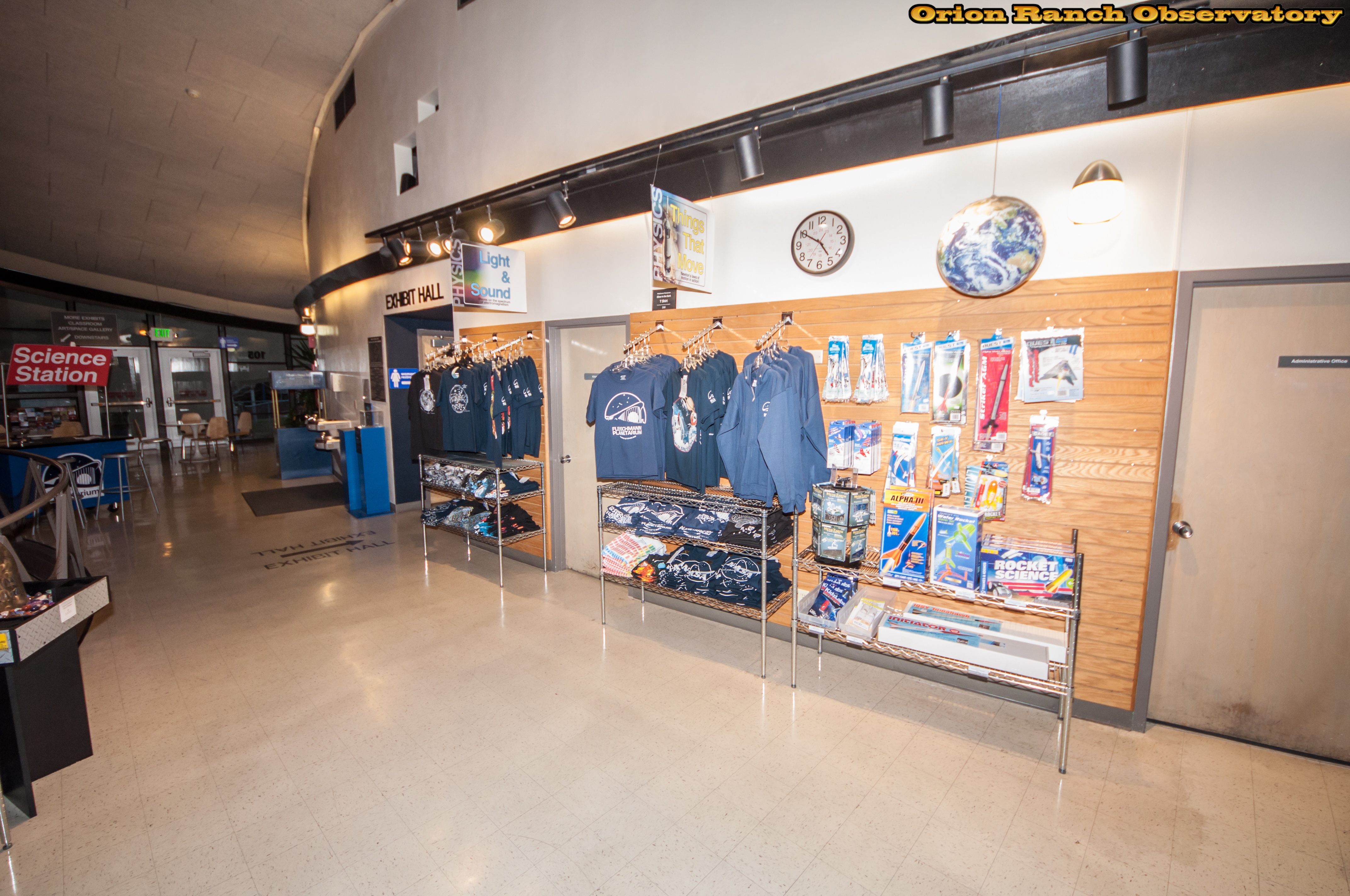 The entrance is through the gift shop and ticket counter. Quite a variety of shirts, science toys, posters, and even binoculars and telescopes.