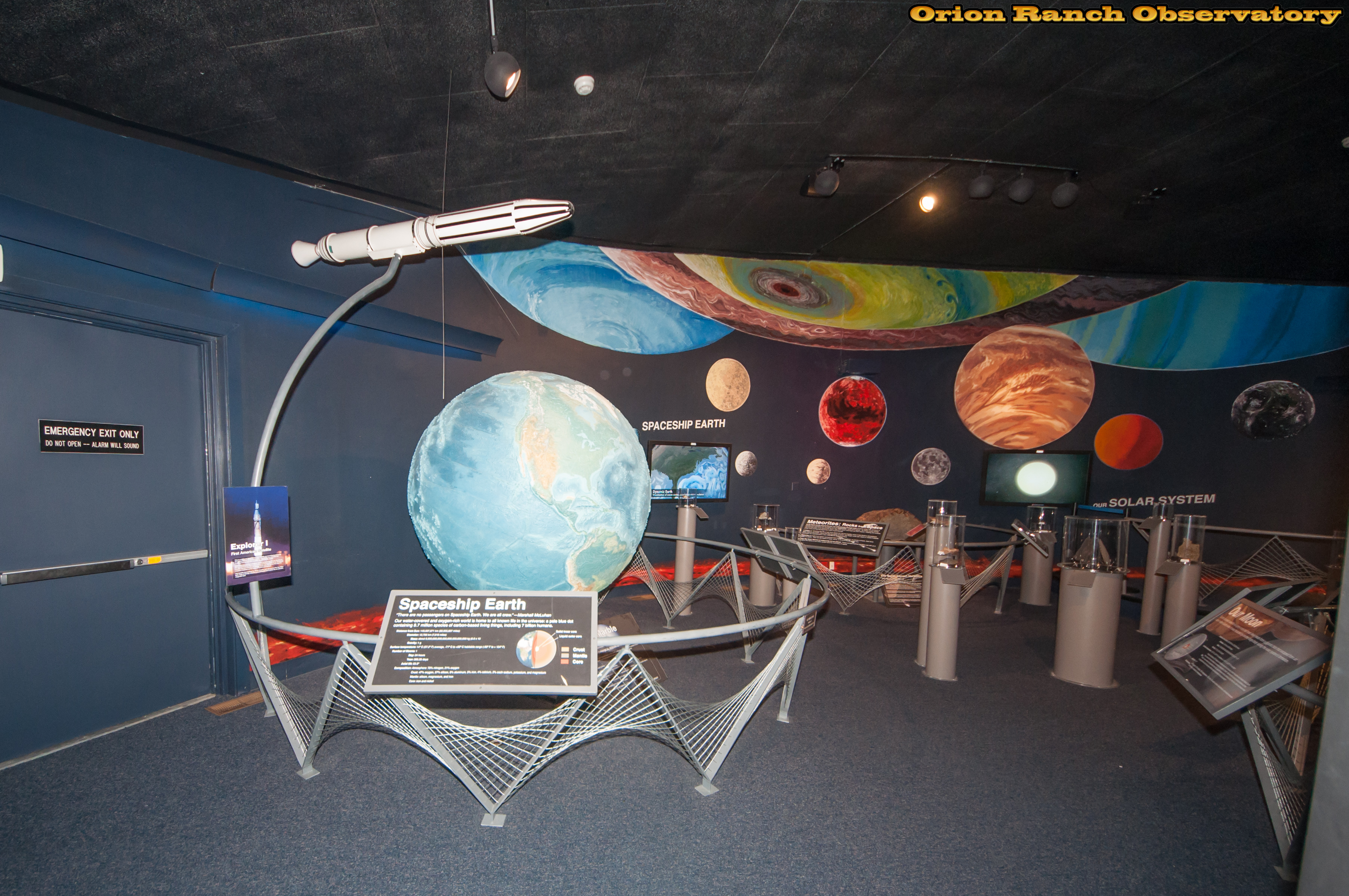 The exhibits are dominated by globes of the Earth and Moon, along with one huge meteorite surrounded by a number of smaller samples.