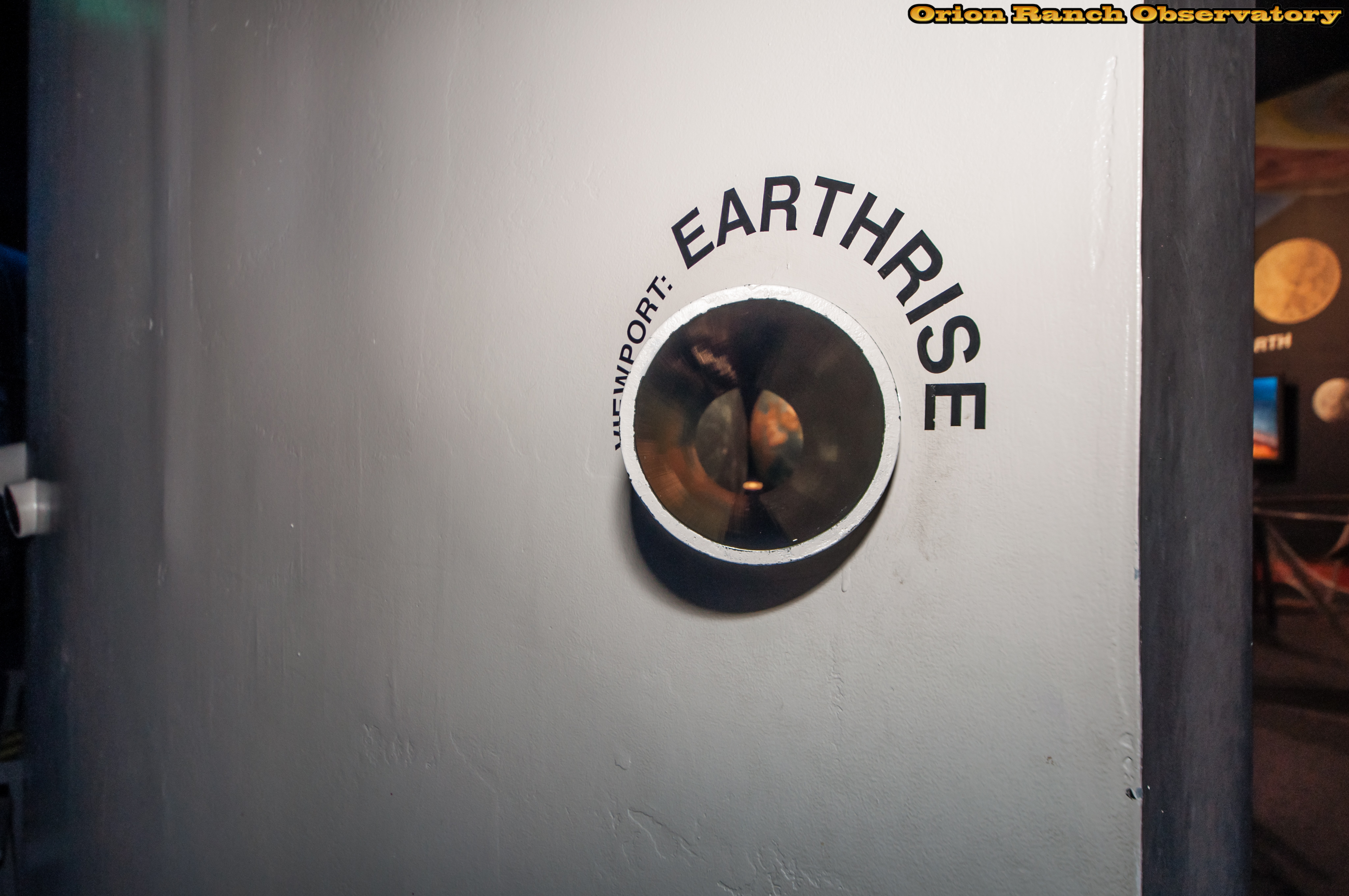 The various portholes in the entrance wall point to several of the paintings across the exhibit far wall. Most are just PVC pipe in the wall, but the central one gives a vew of orbiting the moon as the globe rotates.