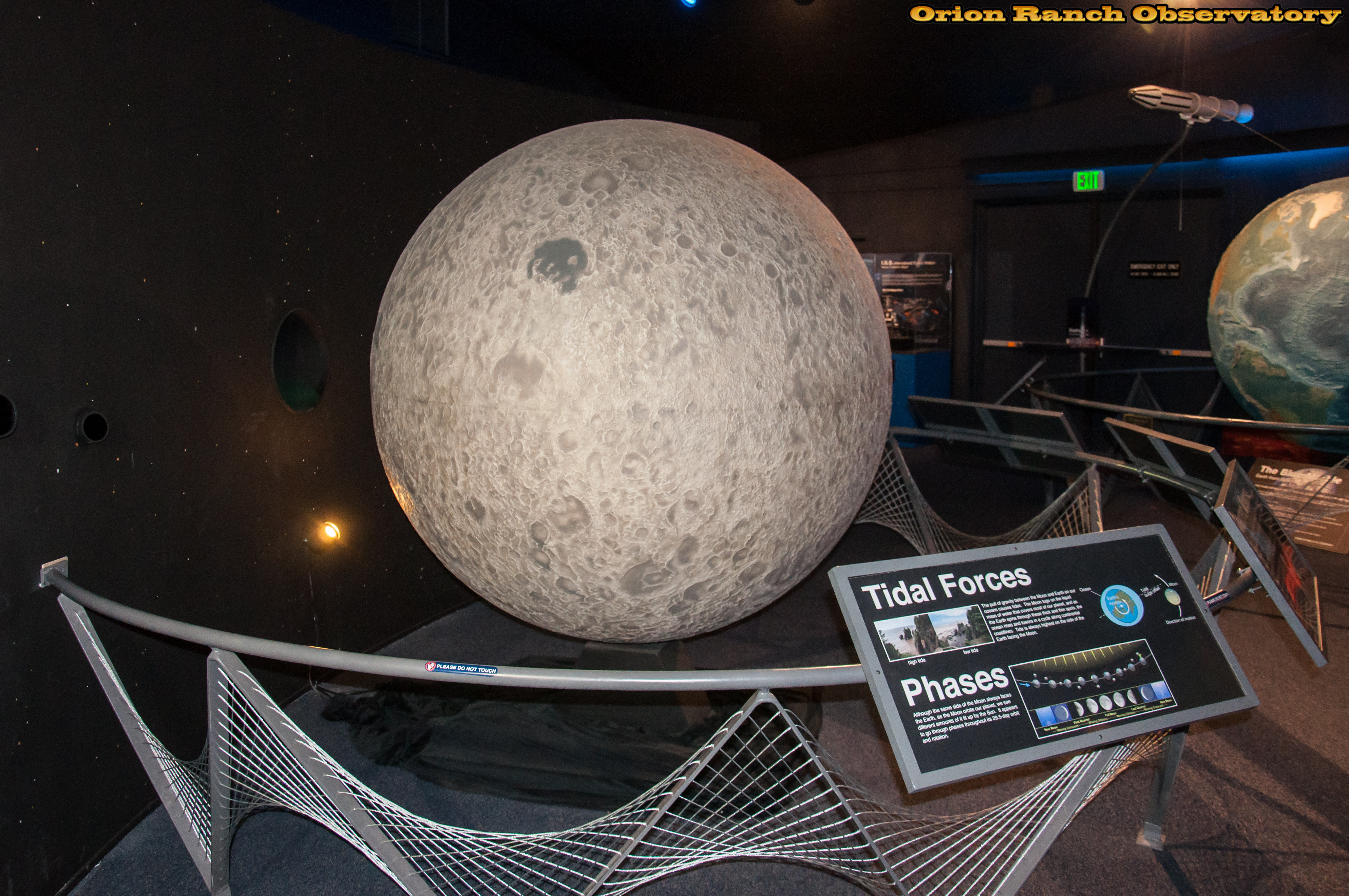 A second large relief globe, this time of our Moon, dominates the center of the room. Flags mark the location of lunar landings.