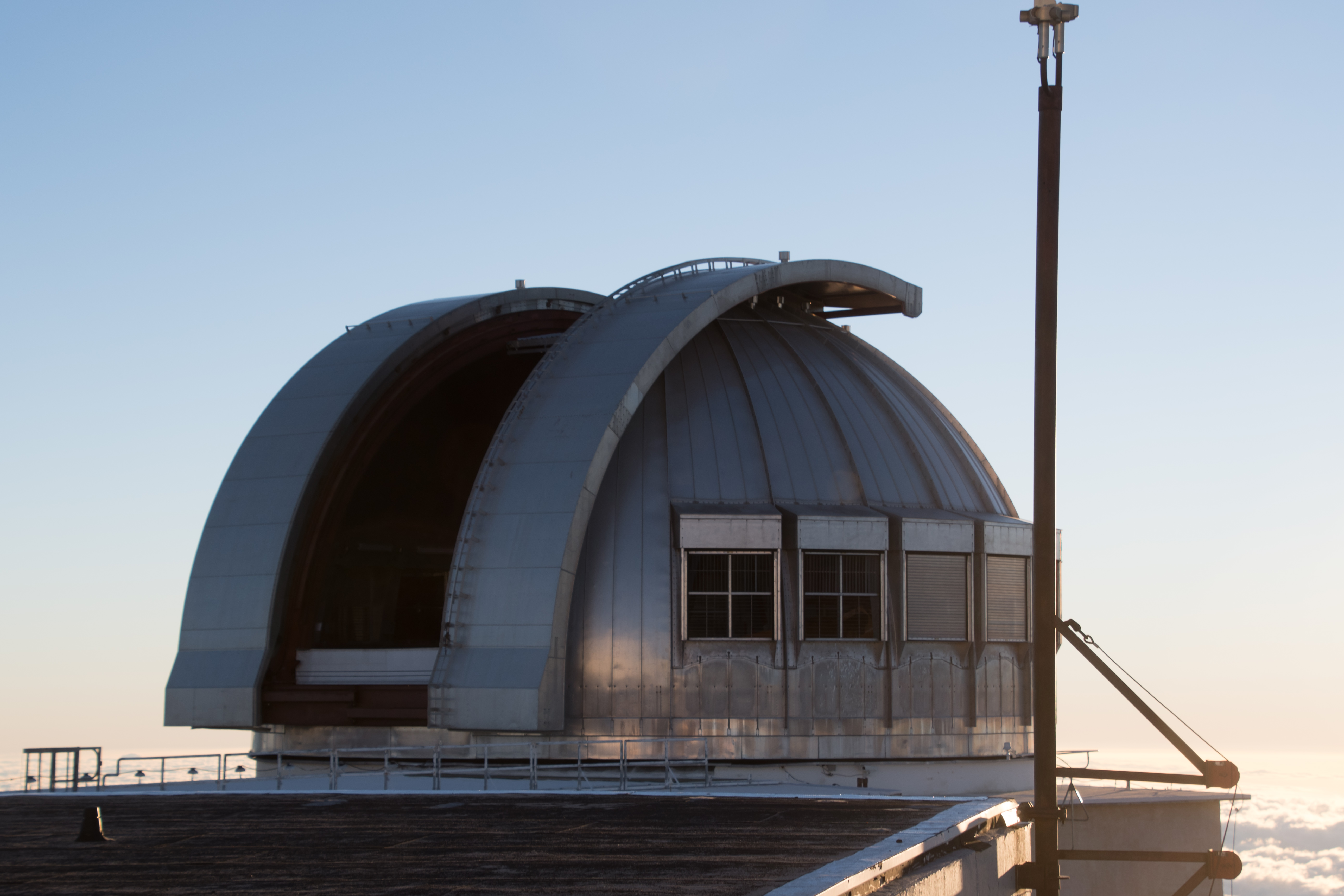 The United Kingdom Infrared Telescope (UKIRT) dome already has the dome doors and several vent windows open prior to sunset.