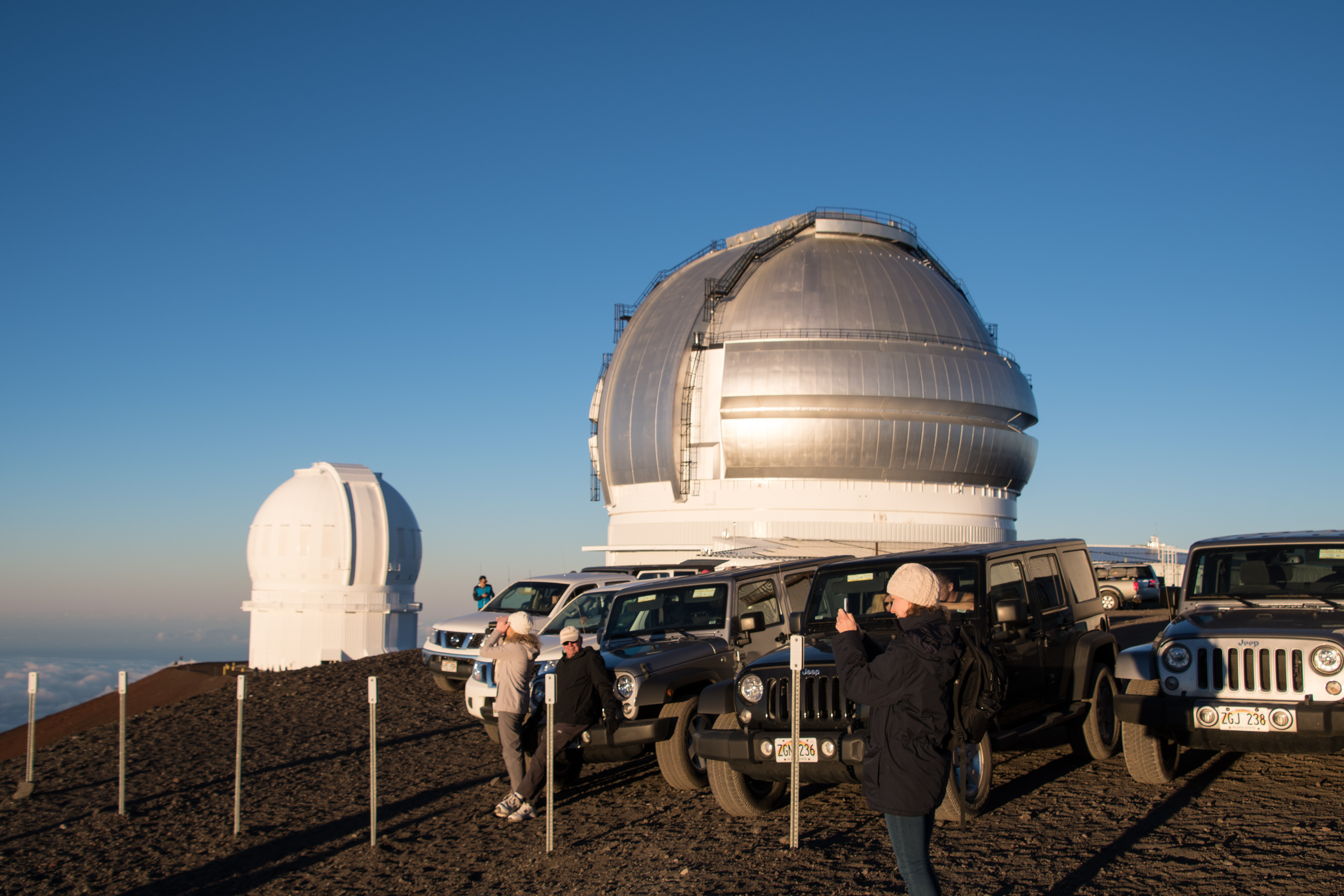 The 8.1 meter Gemini Observatory North (the South one is in Chile) is the silver dome in the foreground, with the 3.6 meter Canada-France-Hawaii Telescope in the white dome in the background. Both are optical/infrared telescopes.