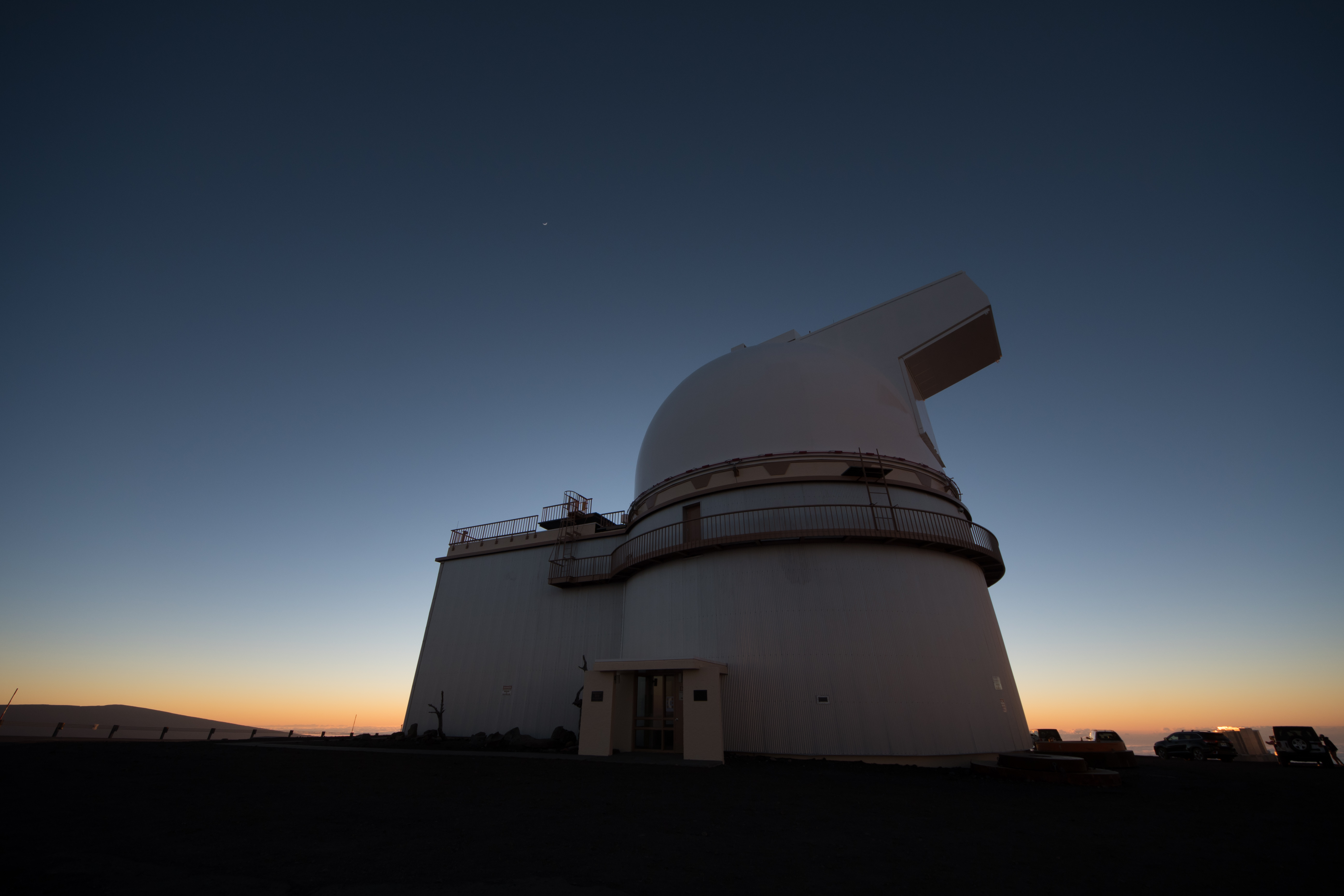 As the Sun sets, the crescent Moon is visible above the University of Hawaii 2.2 m Telescope dome. We would have preferred a new moon for this tour, but the weather was phenomenal, nonetheless.