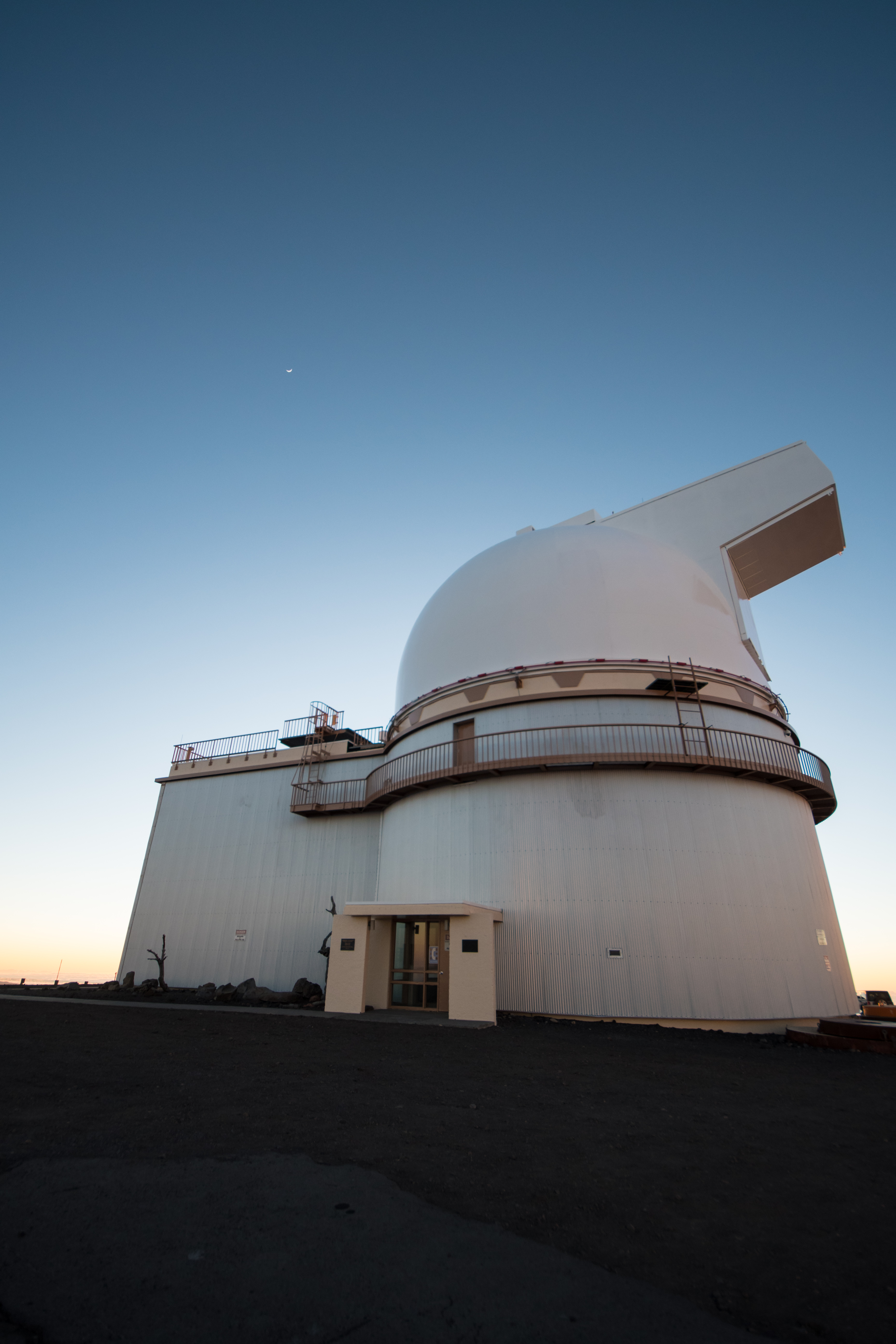 As the Sun sets, the crescent Moon is visible above the University of Hawaii 2.2 m Telescope dome. We would have preferred a new moon for this tour, but the weather was phenomenal, nonetheless.