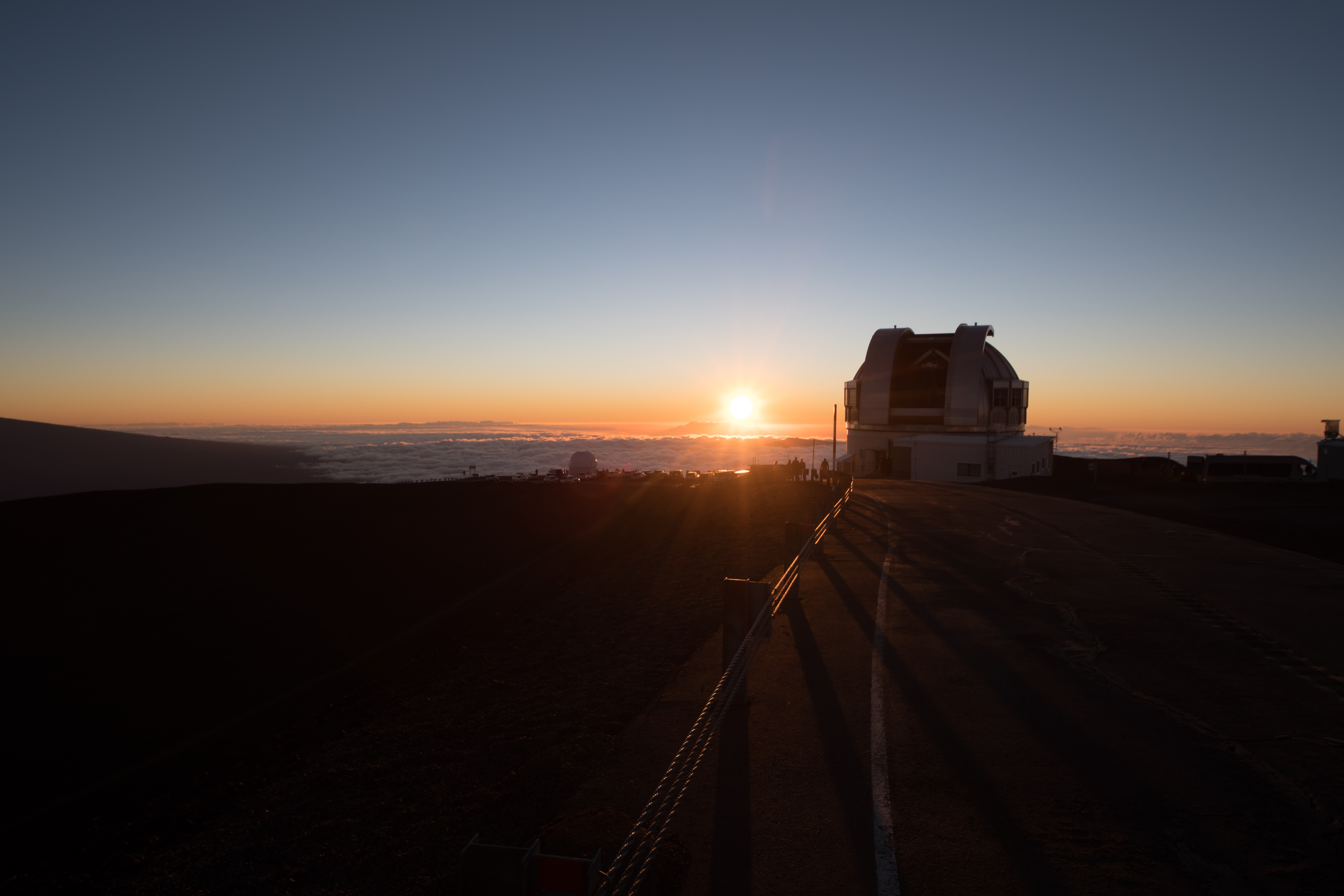 This wide field along the southern side of the summit driveway shows the Sun roughly level with the UK Infrared Telescope. This is one of the only shots showing the decommissioned UH Hilo Educational Telescope down along the road leading to the summit.