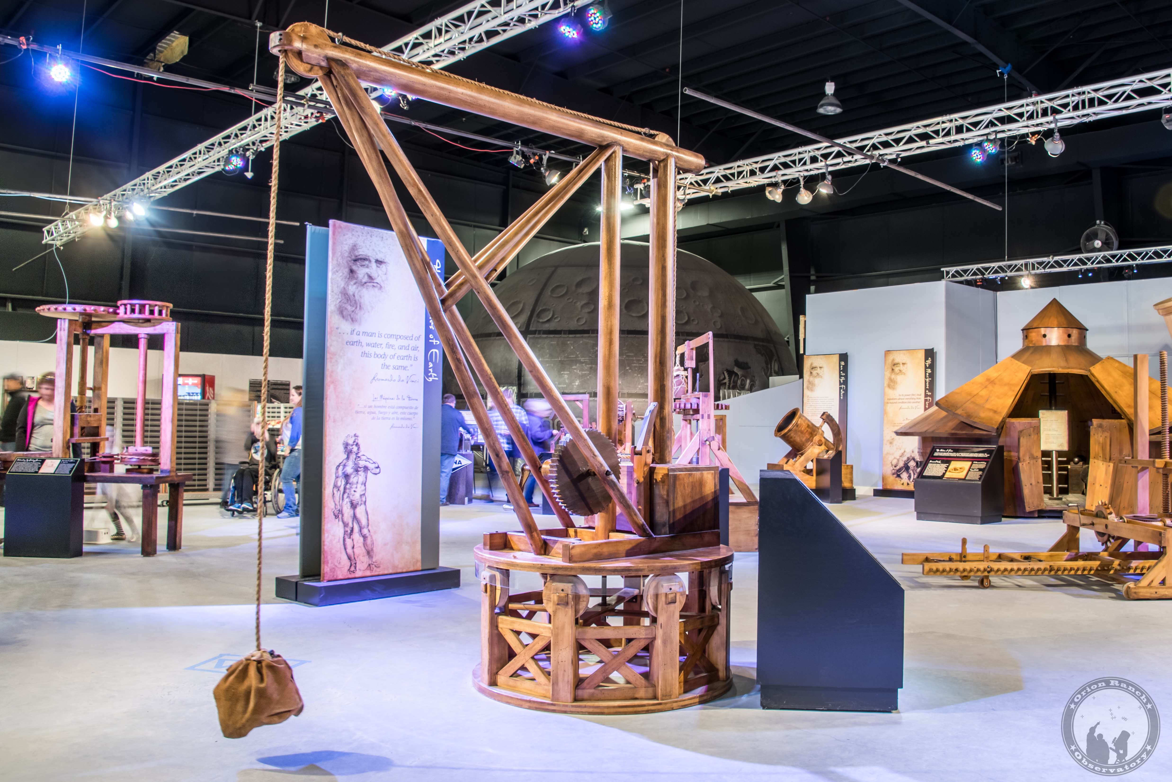 Leonardo designed this crane not only to lift materials but to rotate in a circle, transporting its load from one area to another. The crane utilizes a number of Leonardo's favorite mechanical devices: rope and pulley, winch, friction-reducing wheels, and a locking system to prevent the load from falling.