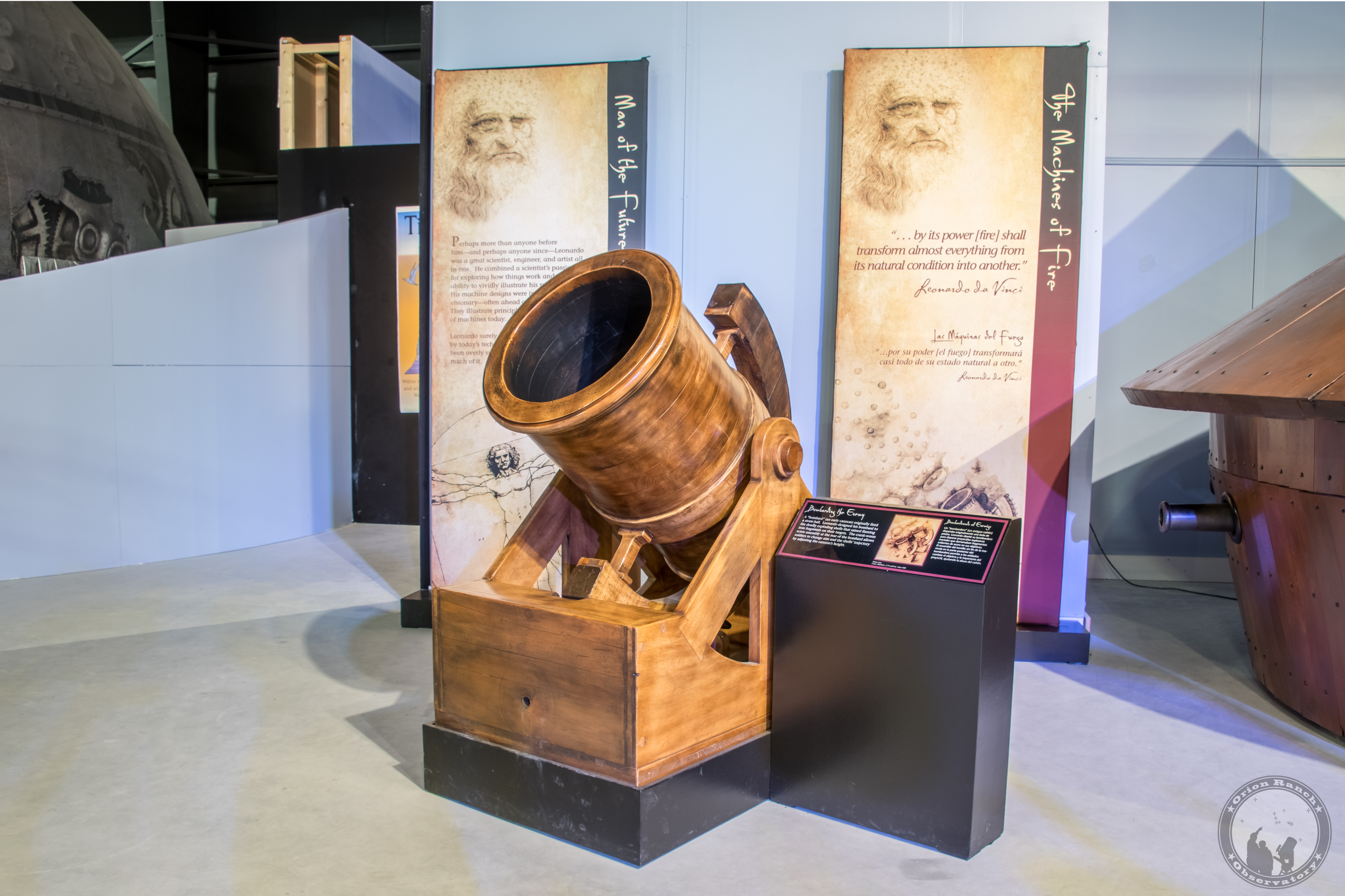 A "bombard" (an early cannon) originally fired a stone ball. Leonardo designed his bombard to fire deadly exploding shells that rained flaming iron fragments on their targets. The crank and worm-screw assembly at the rear of the bombard allows solders to change aim and the shells' trajectory by adjusting the cannon's height.