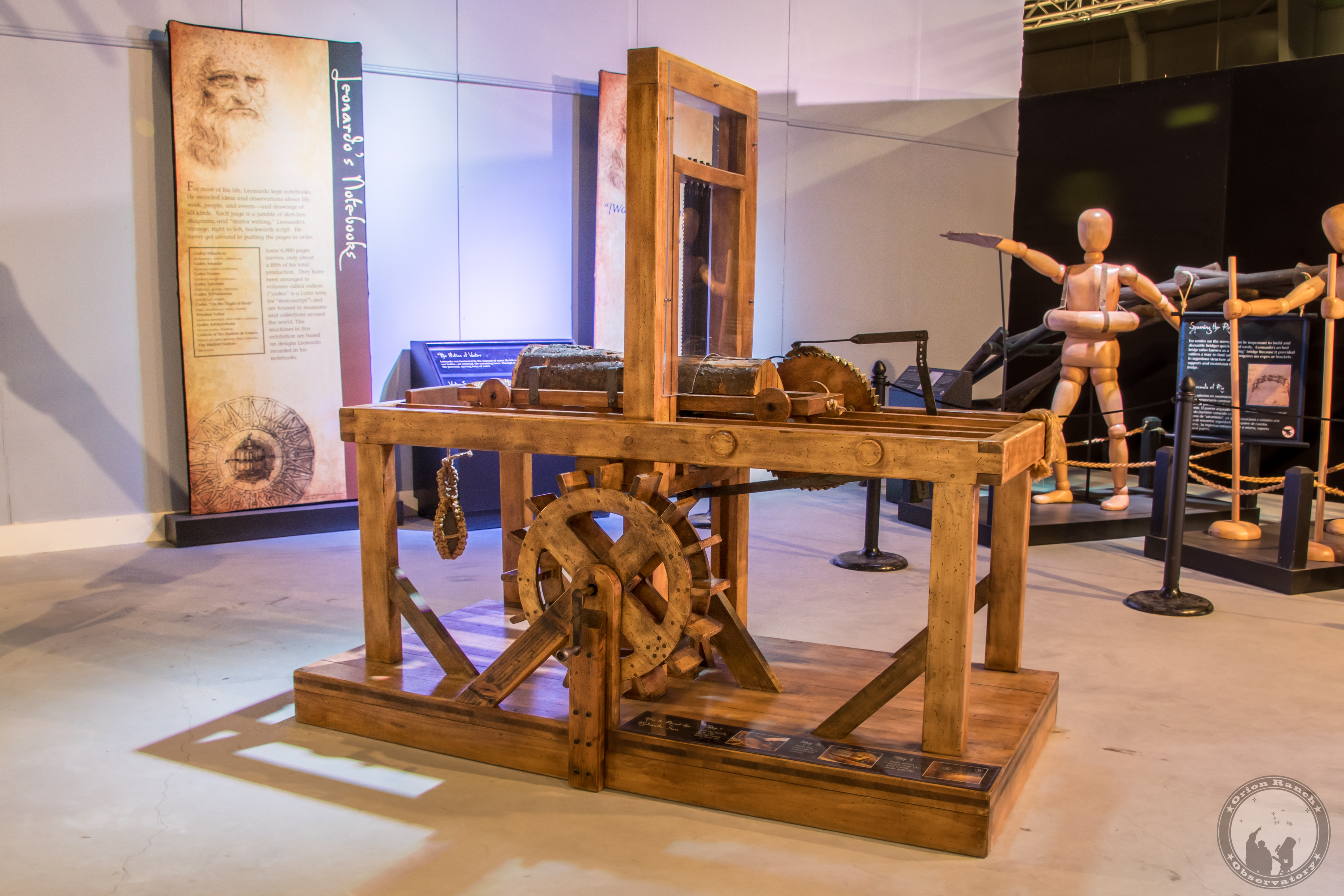 Here Leonardo relied on the force of water to power an automatic saw. Water rushing through a channel spins the paddle wheel, activating the up-and-down motion of the saw and the sideways motion of the wood that slides forward to be cut.