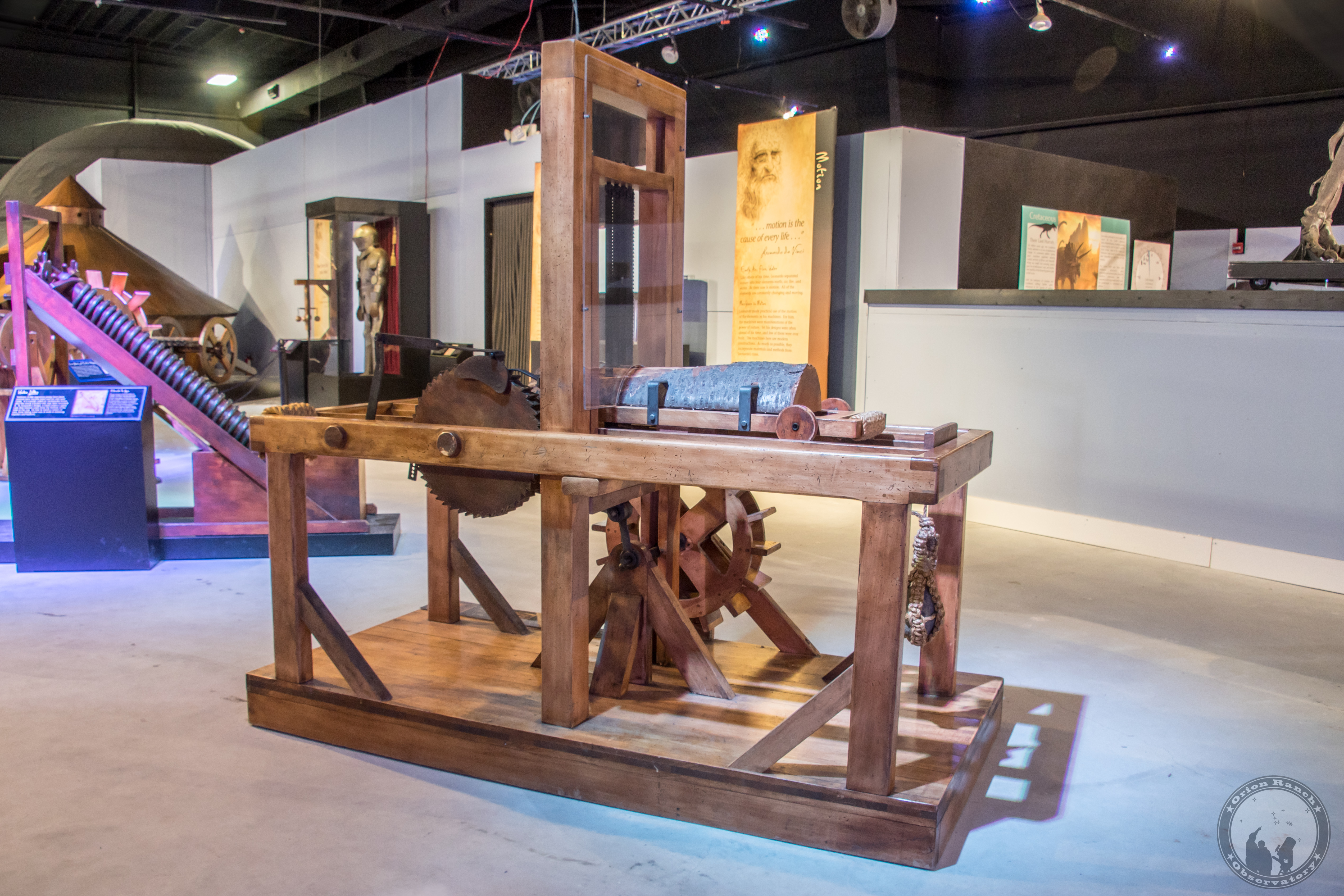 Here Leonardo relied on the force of water to power an automatic saw. Water rushing through a channel spins the paddle wheel, activating the up-and-down motion of the saw and the sideways motion of the wood that slides forward to be cut.
