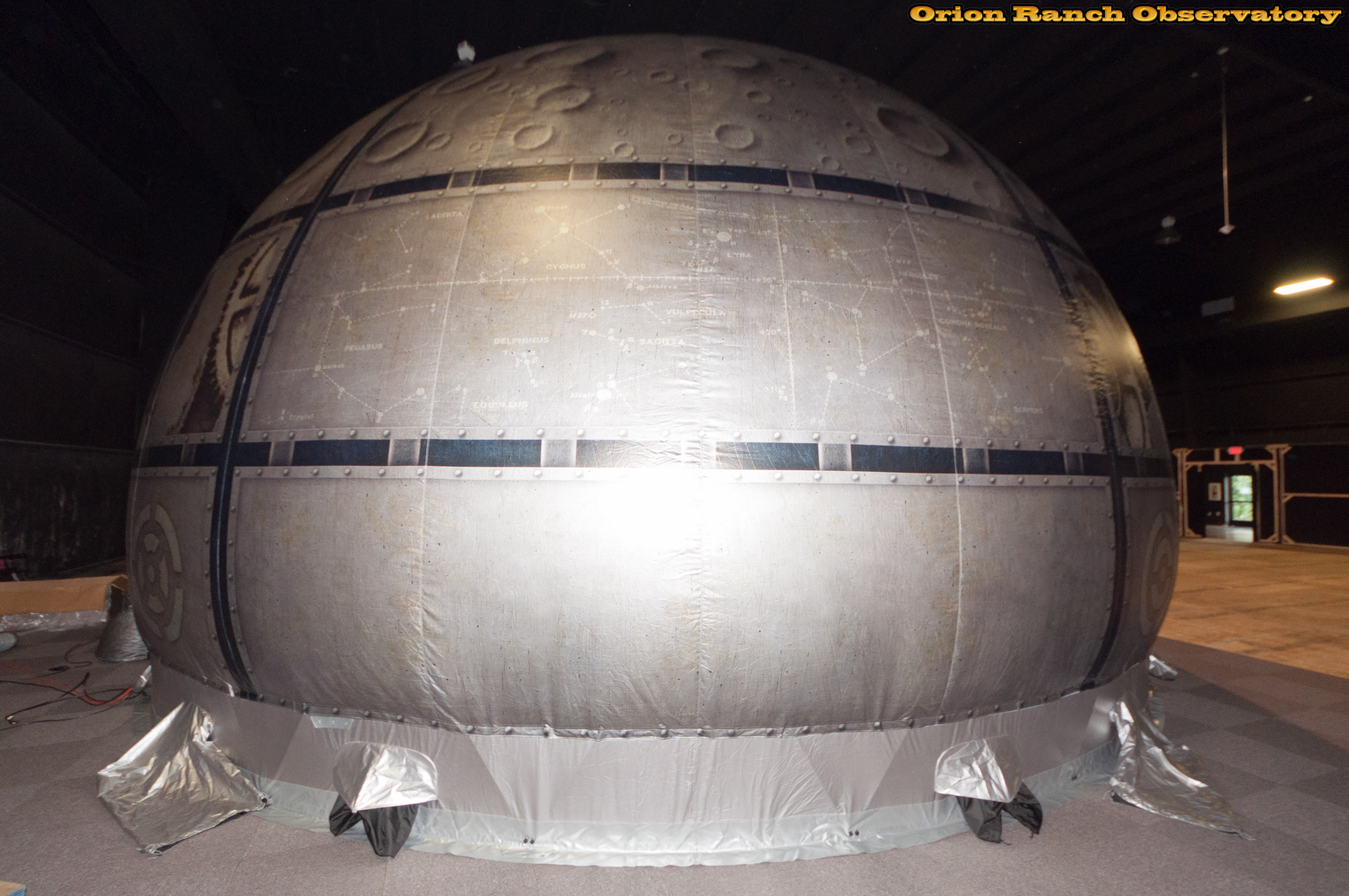 Various views around the planetarium dome, showing the air system that keeps the dome taught on the geodesic framework to keep the interior spherical. Some nice detail with the constallations and various other decorations.