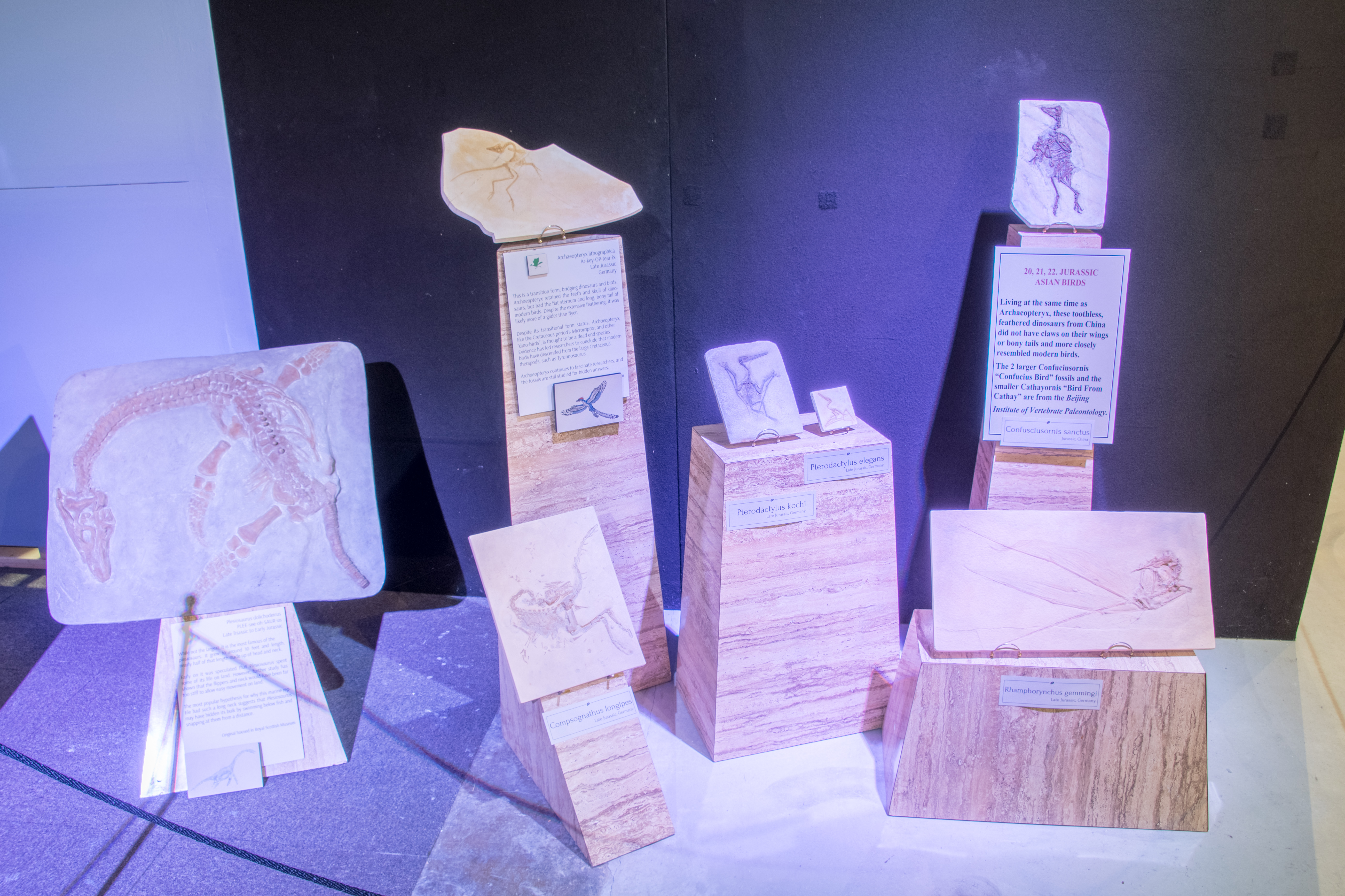 Pterodatylus, Archaeopteryx, Rhamphorynchus, Confusciusornis, Plesiosaurus