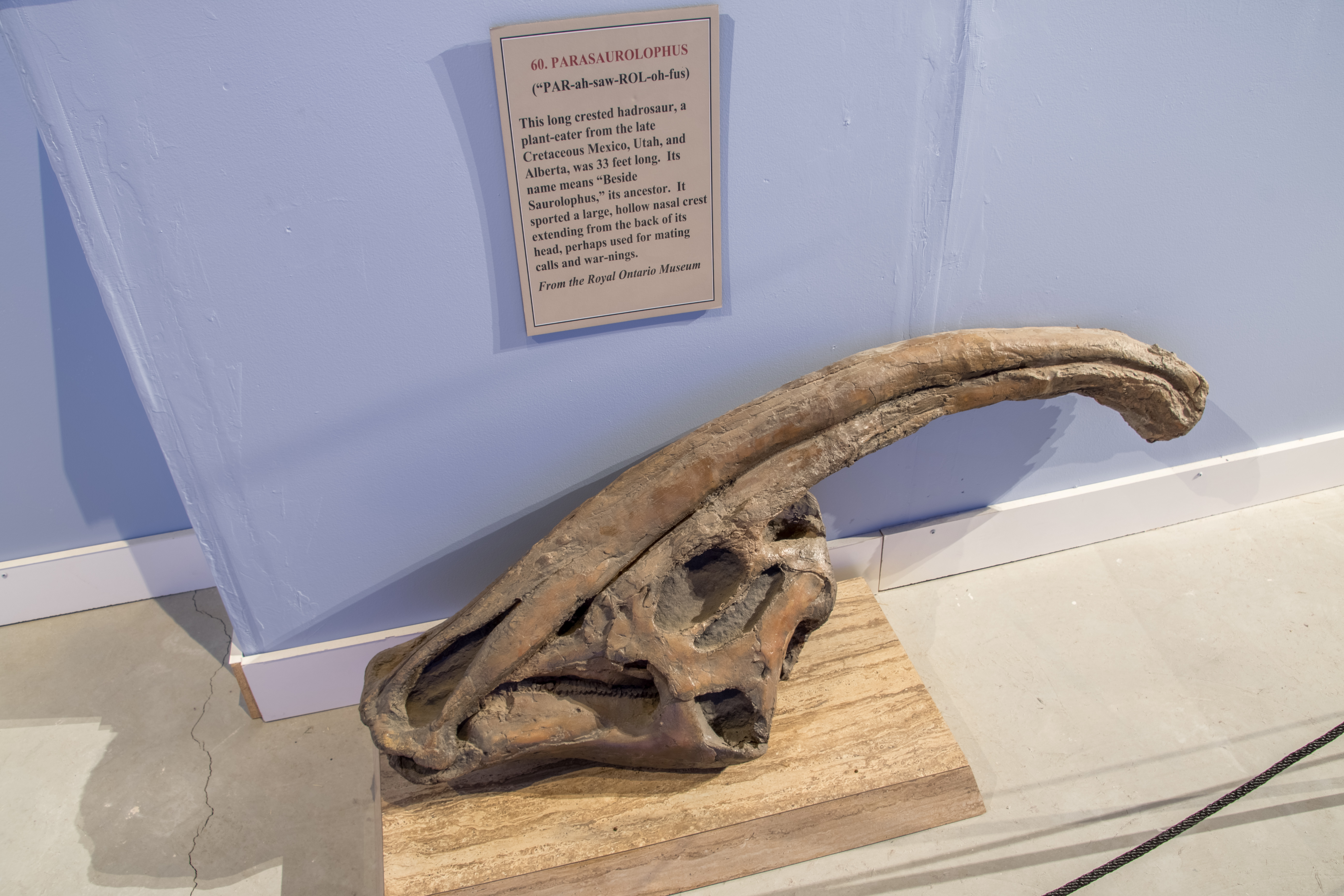 This long crested hadrosaur, a plant-eater from the late Cretaceous period found in Mexico, Utah, and Alberta, was 33 feet long.