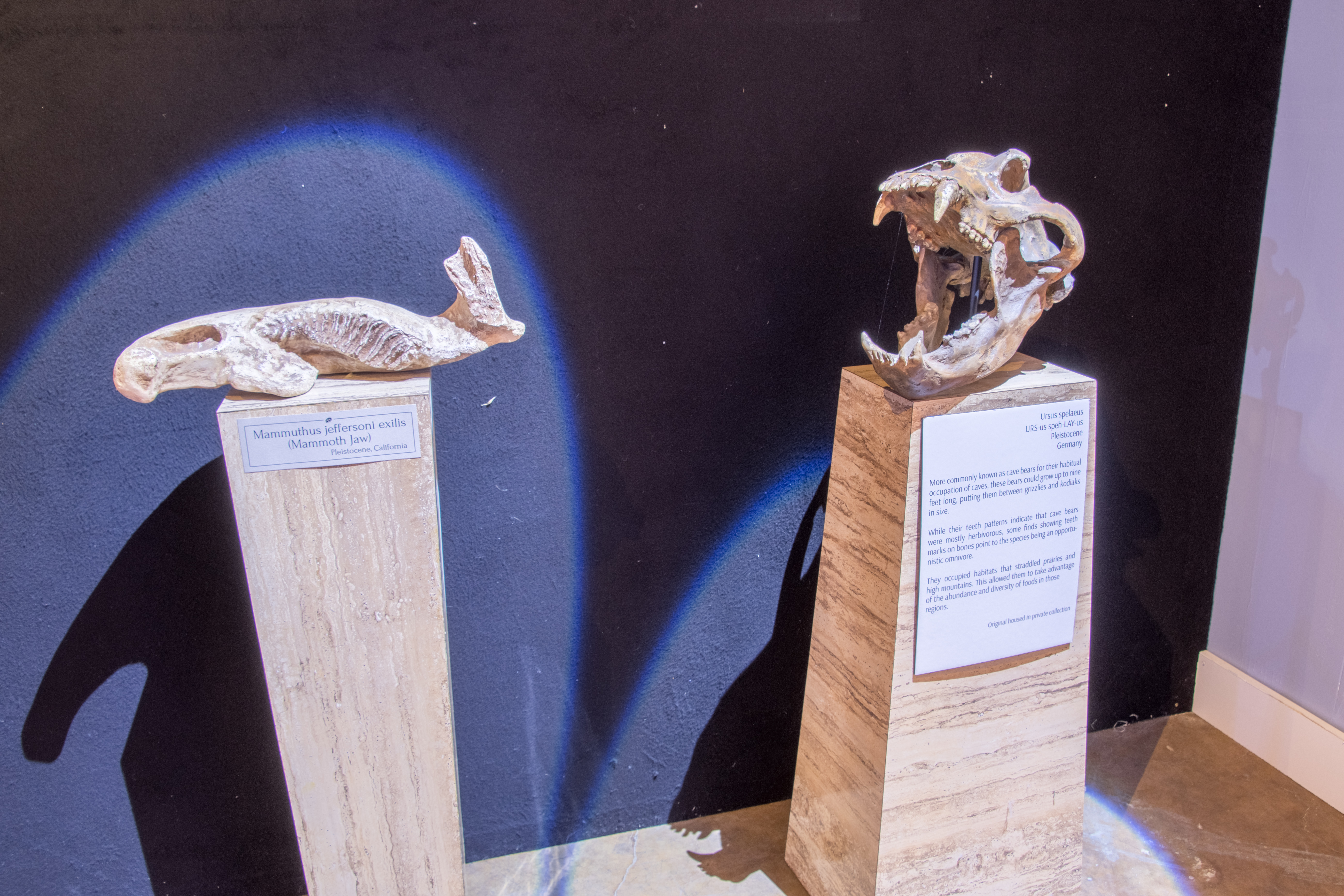 Mammoth jaw and cave bear skull from the Pleistocene epoch.