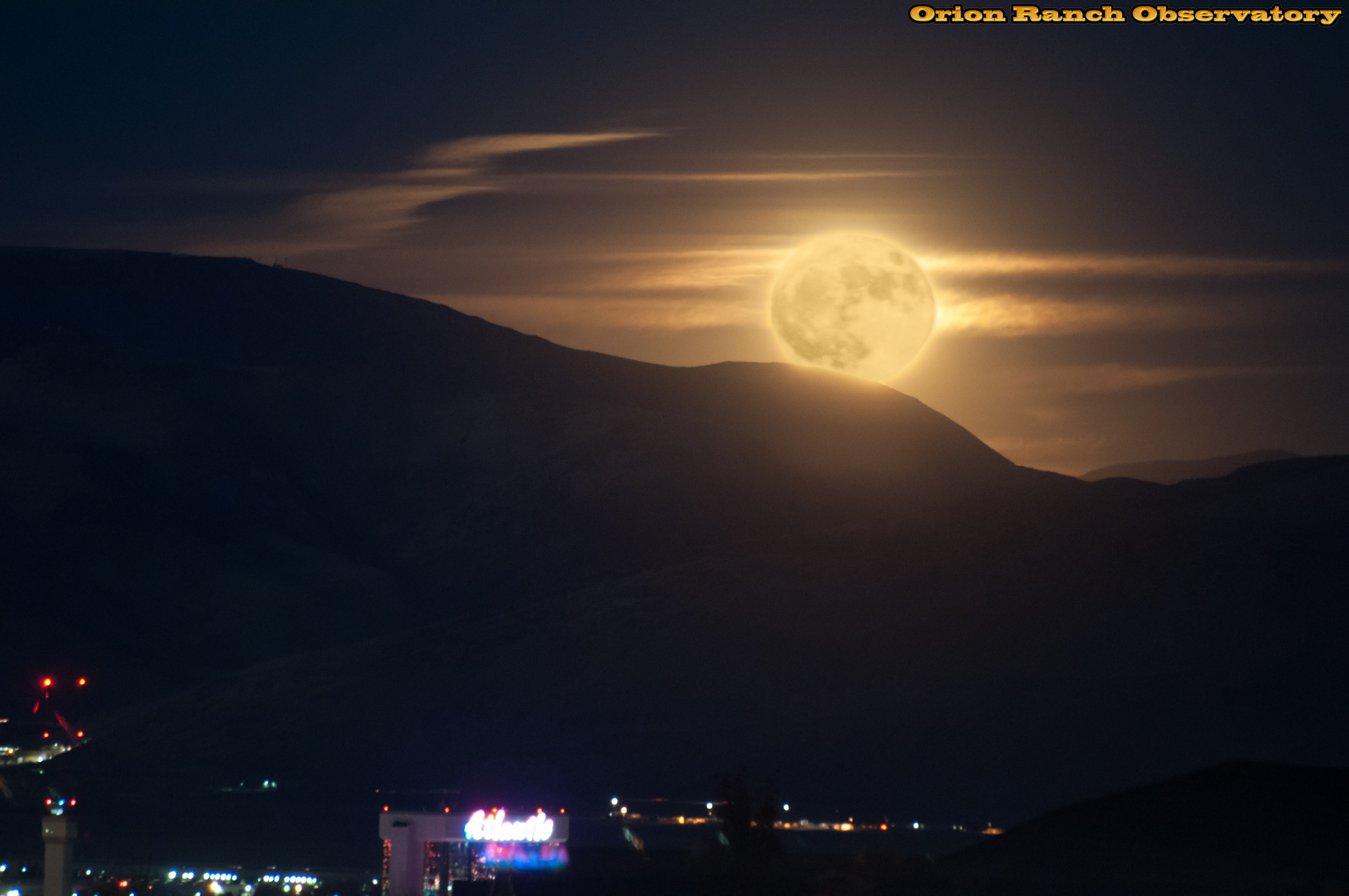 Various shots of the super moon rising over Reno, Nevada that evening. The mountains give a nice backdrop when you can see them. This shot is composited from a long exposure (the previous image) to get the background, and a lower exposure (the next image) to get the face of the moon.