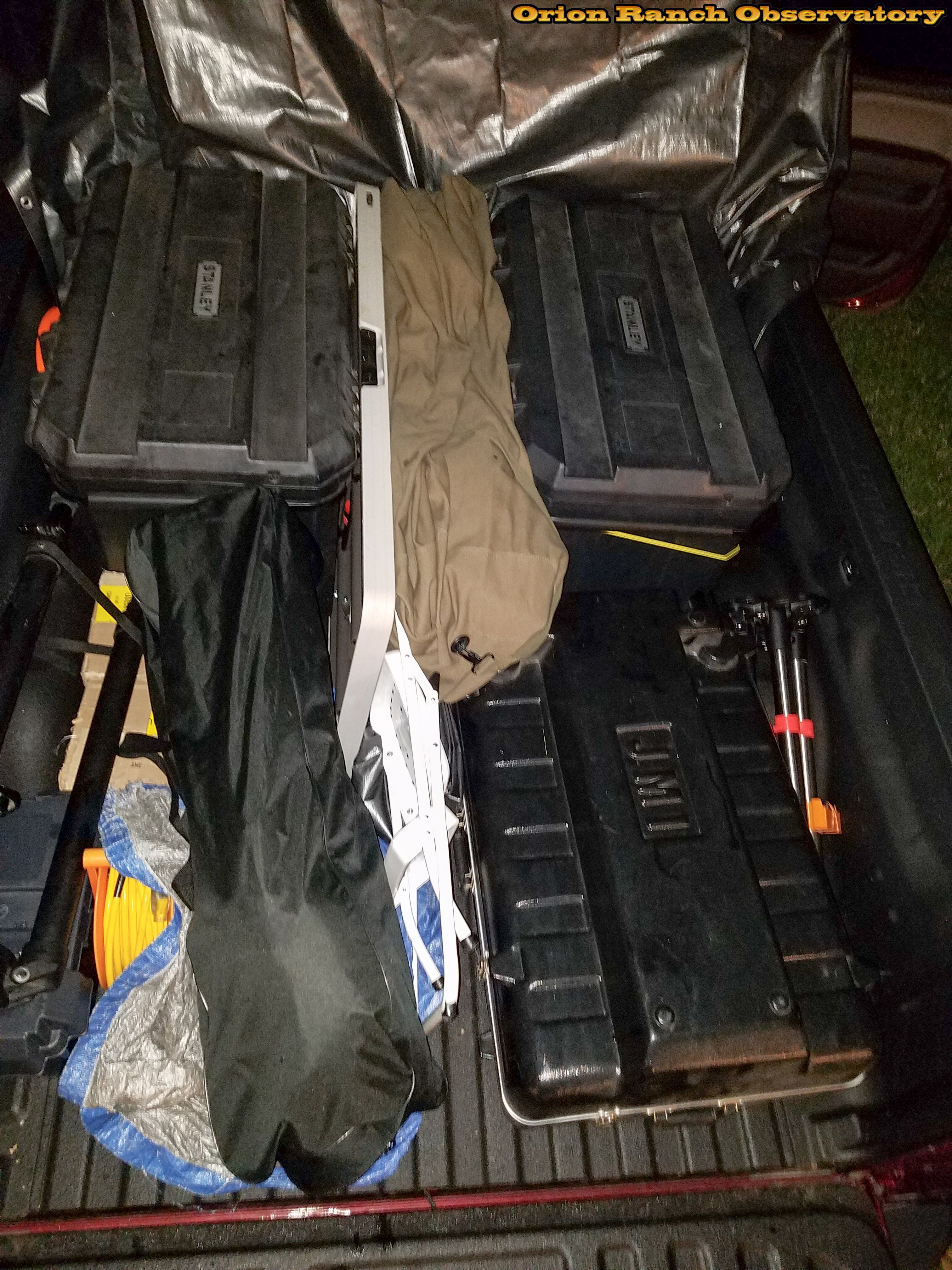 Truck bed loaded with cases containing 8 & 11" NexStars, ED80, eyepieces, power, battery, chairs, table, awning, weights, tarp, etc. All coverd with tarp and netting.