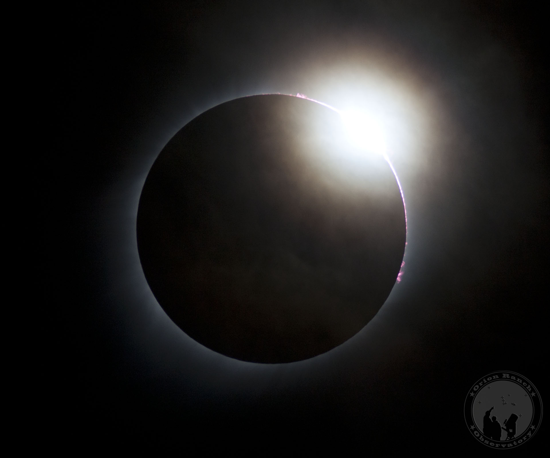 This is the famous "Diamond Ring" view of the eclipse where the Sun starts to peek out from behind the moon and over-exposes the image (and lights up the hazy atmosphere) in that region, while the corona and flares are still visible. After this point, the solar filter was re-applied to the lens.