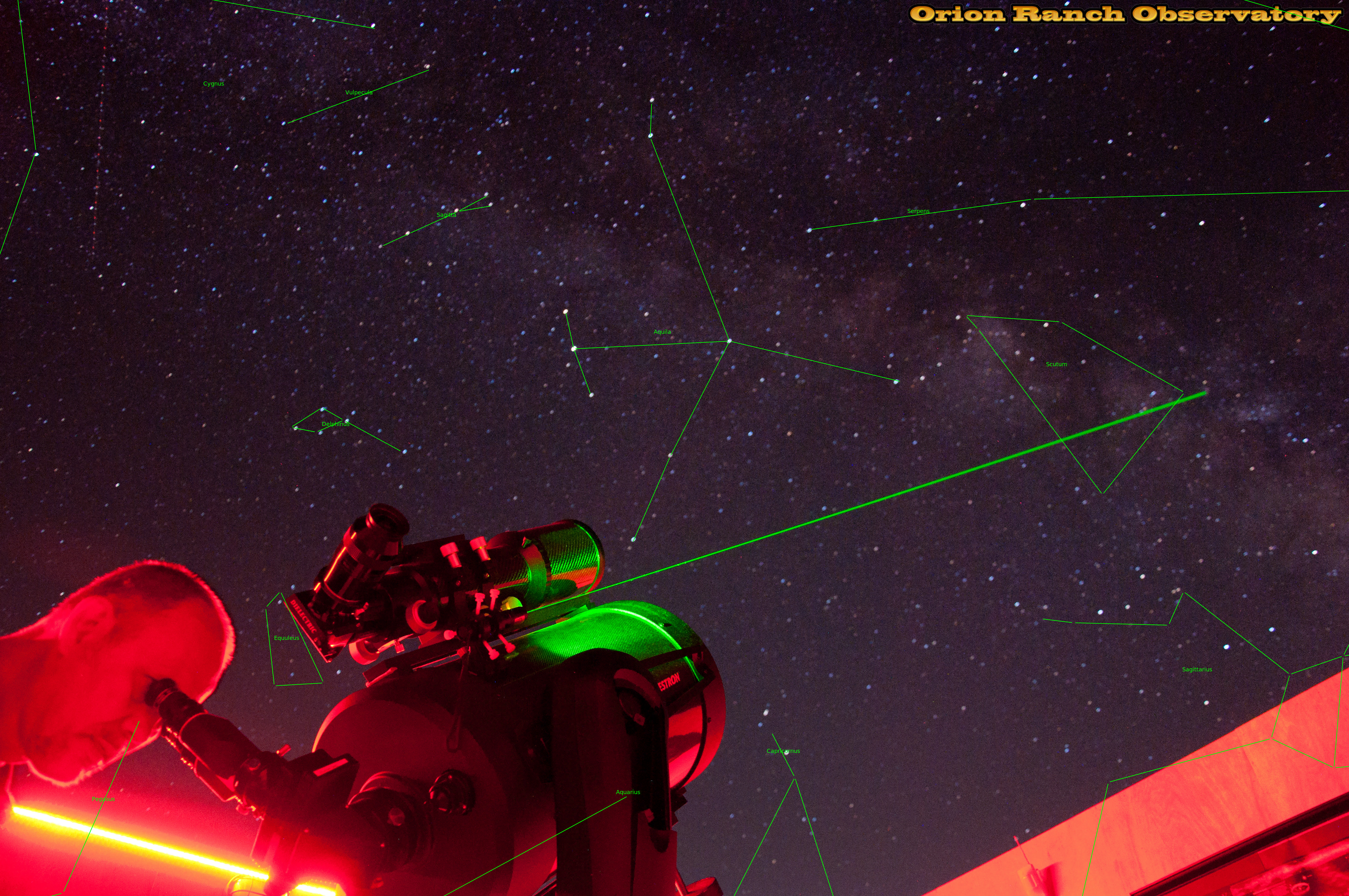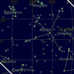Principal objects in field: Filamentary nebula, IC 4701, Lace-work nebula, NGC 6604, NGC 6960, NGC 6992, Network nebula, Part of the constellation Capricornus (Cap), Part of the constellation Cygnus (Cyg), Part of the constellation Pegasus (Peg), Part of the constellation Sagittarius (Sgr), Part of the constellation Serpens (Ser), The constellation Aquila (Aql), The constellation Delphinus (Del), The constellation Equuleus (Equ), The constellation Sagitta (Sge), The constellation Scutum (Sct), The constellation Vulpecula (Vul), The star Albireo (β1Cyg), The star Altair (αAql), The star Ascella (ζSgr), The star Dabih (βCap), The star Enif (εPeg), The star Gienah (εCyg), The star Nunki (σSgr), The star Tarazed (γAql), The star ζAql, The star πSgr, Veil nebula
