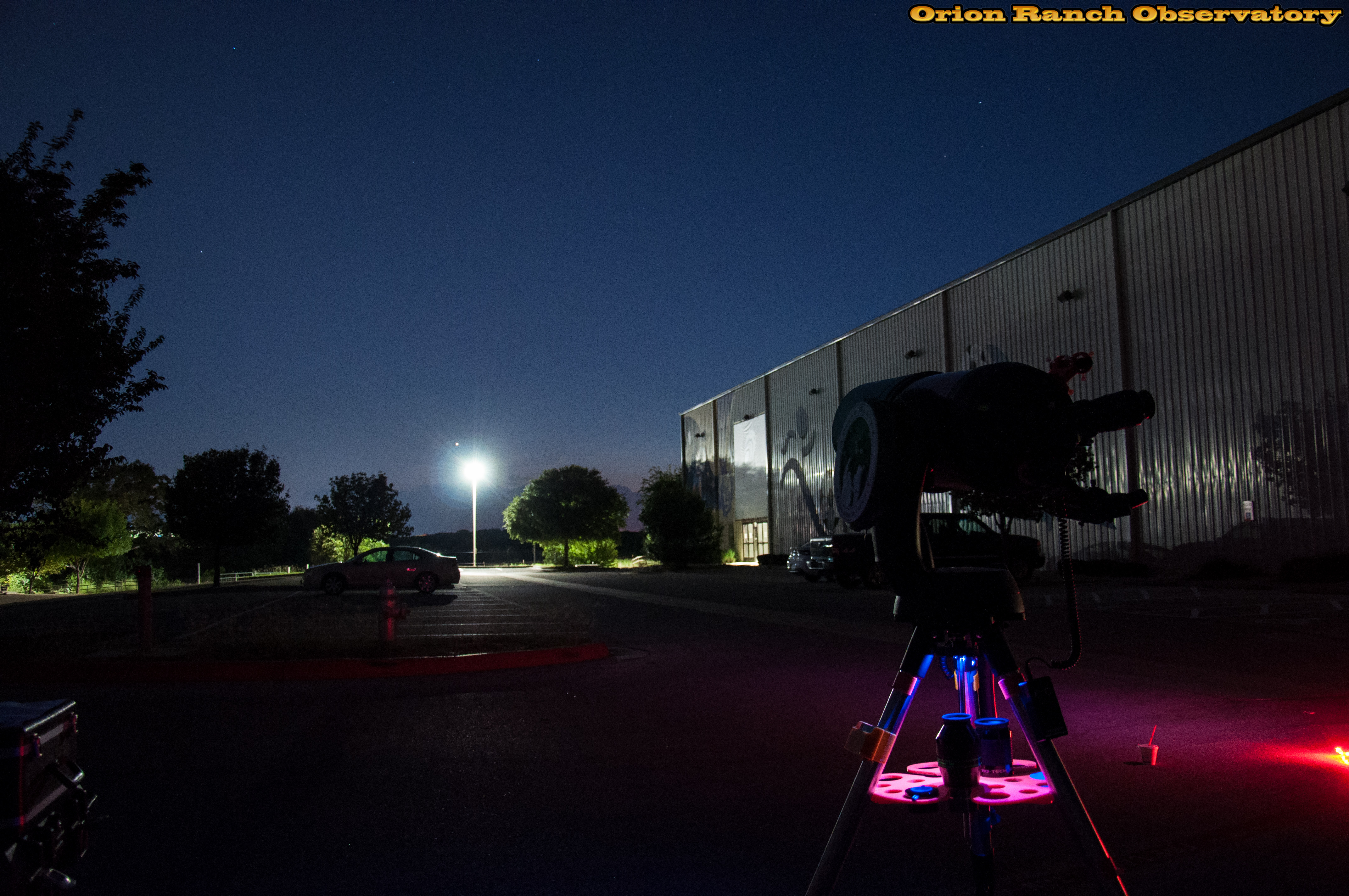 As you can see from the parking lot, it's a slow night at TXMOST, which is currently housed in its temporrary location of an old indoor soccer field. You can see Venus just above the street light as it gets dark. Whose cup is that? =)