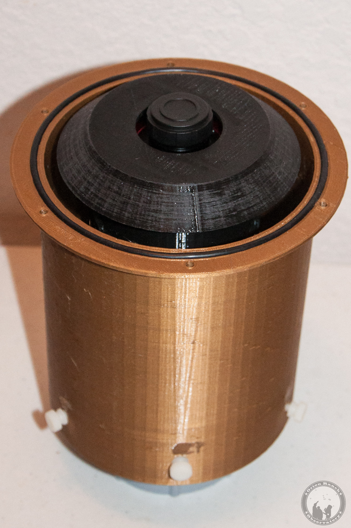 The outer cover goes on last. The dome will already be attached when installed in the field. Note the o-ring instead of foam gasket.