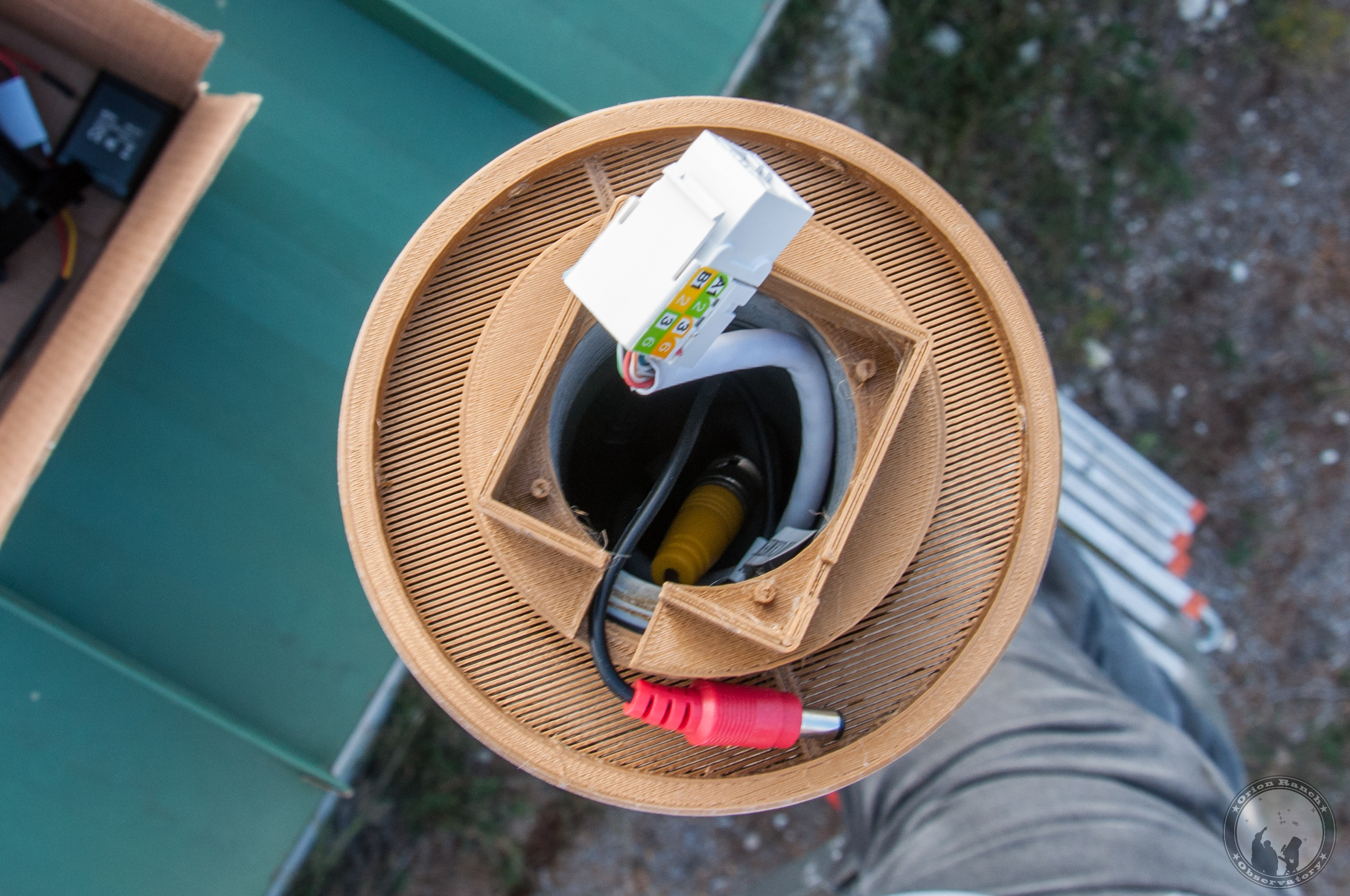 With the base installed, you can see the CAT5e connection (actually think it's CAT6 cable here) and the 12V power connector from the NTSC camera.