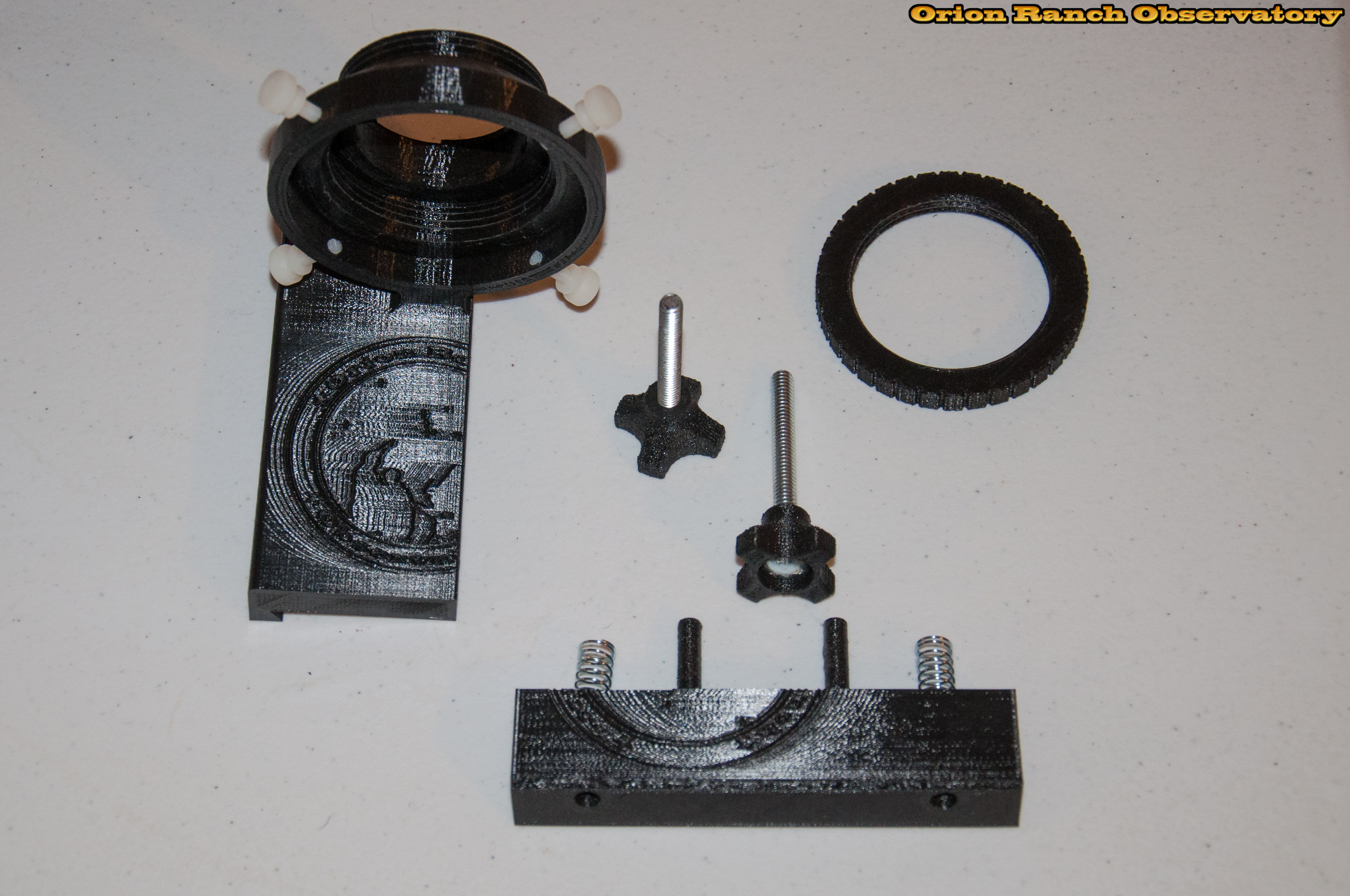 The main adapter body and larger part of the rail are printed together. The clamp assembly includes two guide pins, and springs go around the 1/4-20 bolts used to clamp it. The carriage bolts press fit into the knobs and the clamp ring screws on outside to hold the lens tightly. Not shown is the internal ring for holding the filter, which is taken from the