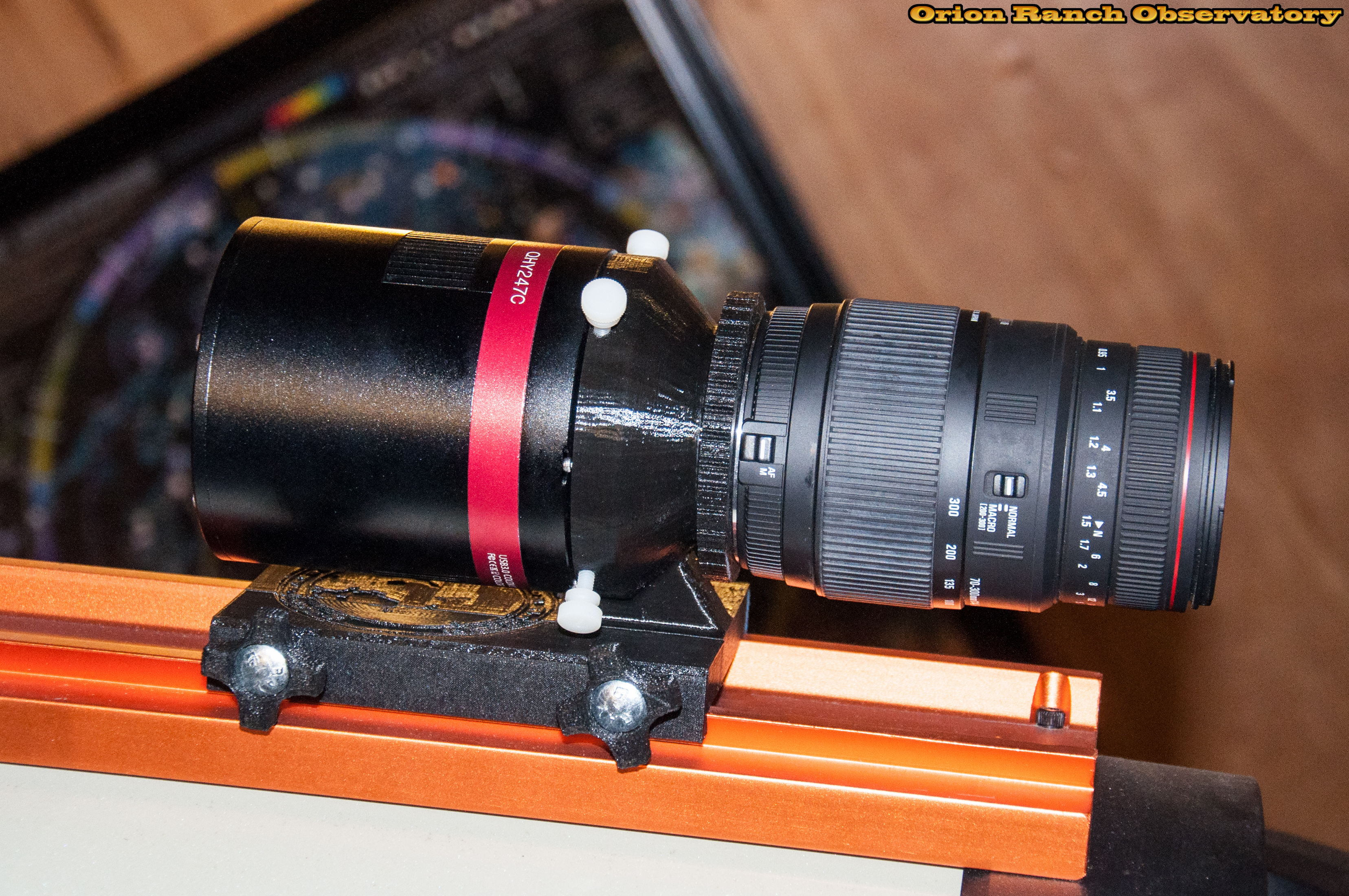 The adapter mounts perfectly to the top Losmandy rail of my 11" Edge HD and then the camera and lens (in this case my Sigma 70-300mm zoom) attach cleanly. Can you spot my one OOPS! in the adapter design? You should see it here. When I added the base, I put it on the wrong side of the adapter, so the lens top is "down" when installed. Actually it's better that way since when the scope is in use I can still see the focus marks. However, if I ever reprint it, I'll change it to put the top of the lens to the side.