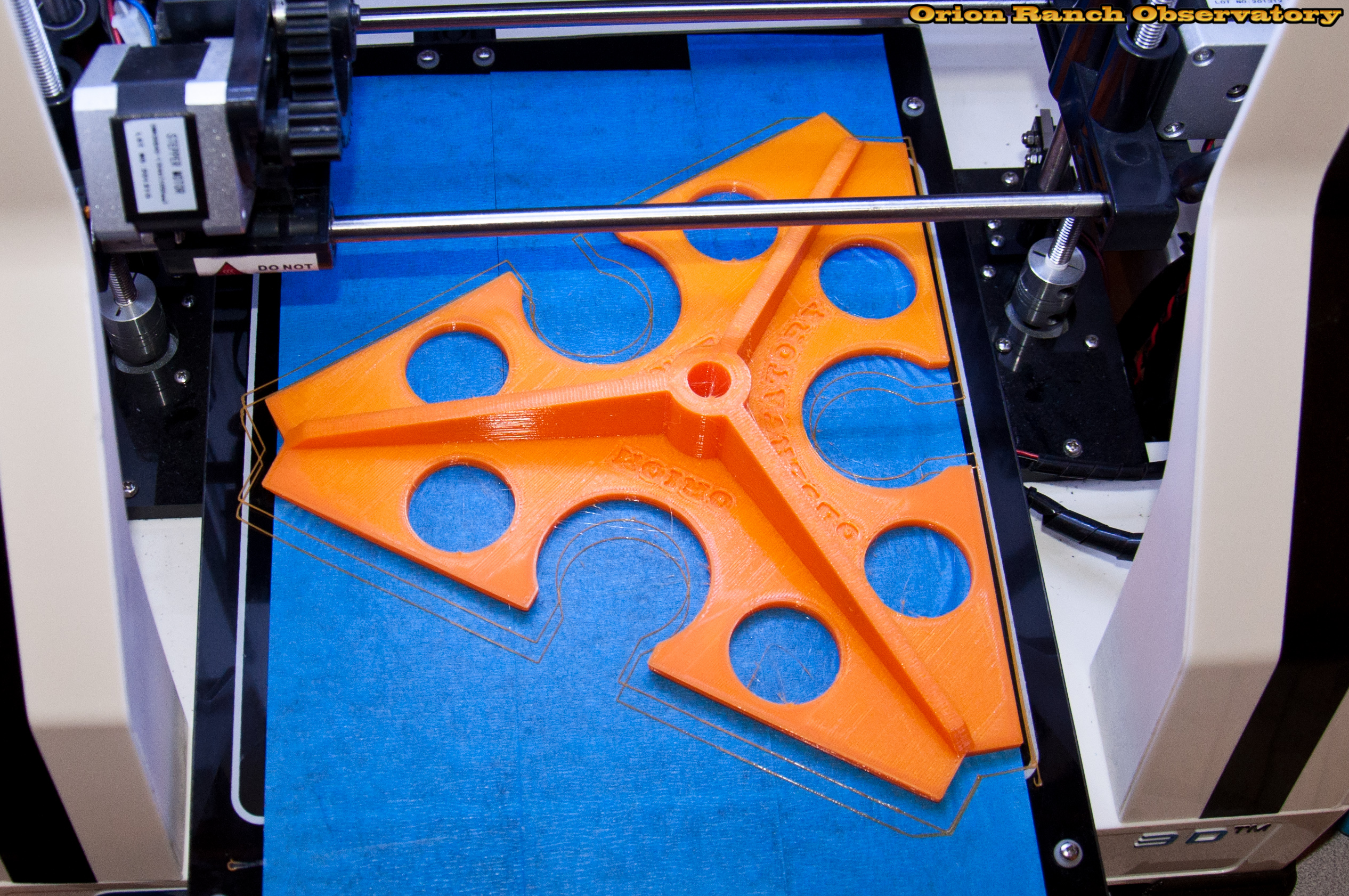 Some shots of the latest leg spreader design on the printer. This design is at the limit of the printable size, and the boundary line that it draws around the print went outside the printable area and caused problems.