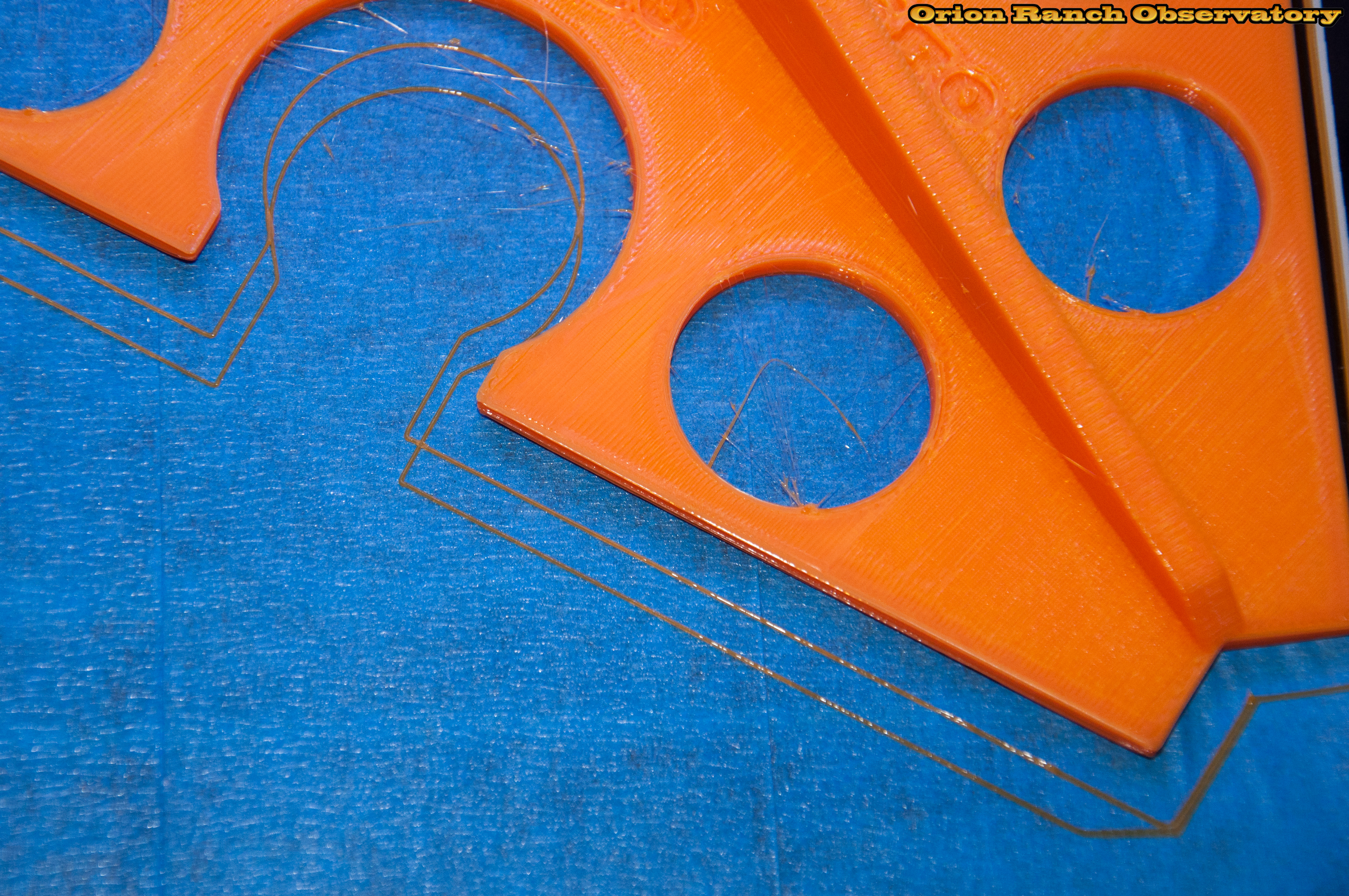 Some shots of the latest leg spreader design on the printer. This design is at the limit of the printable size, and the boundary line that it draws around the print went outside the printable area and caused problems.