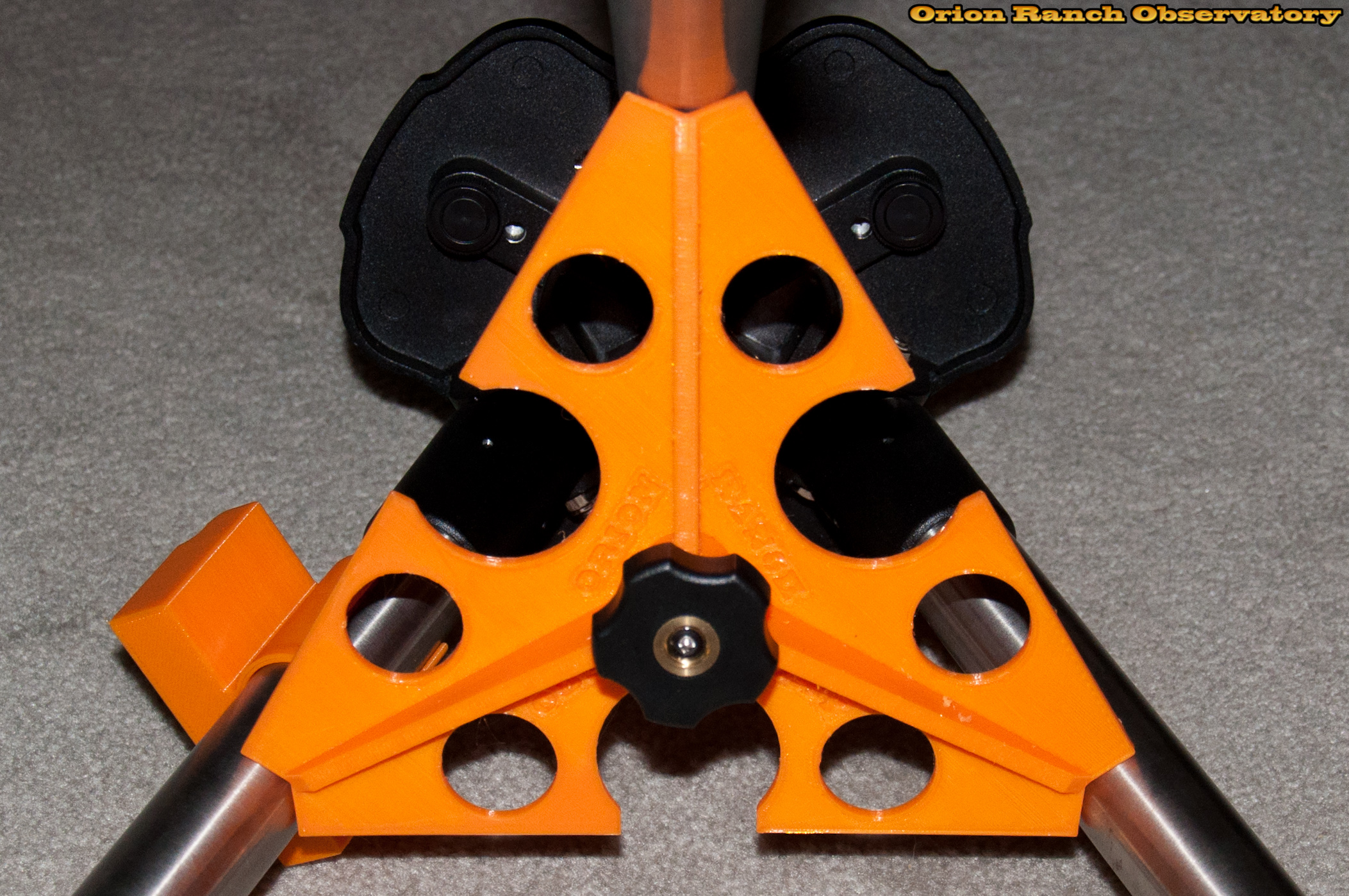 Here the legs are locked open with the spreader. With the larger radius (maximum I could print) and taller center column (both for a stronger rib and to increase height) the knob only needs to go on a few turns. I may actually shorten the center tube slightly to give a bit more release to toggle to closed mode. As is, the knob has to almost come off completely to toggle modes.